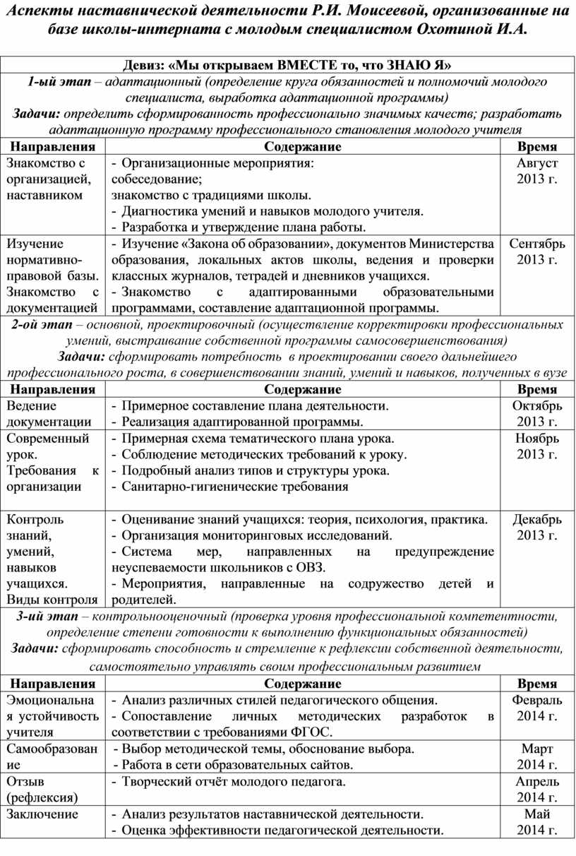 Анализ работы педагога-наставника Моисеевой Раисы Ивановны по сопровождению