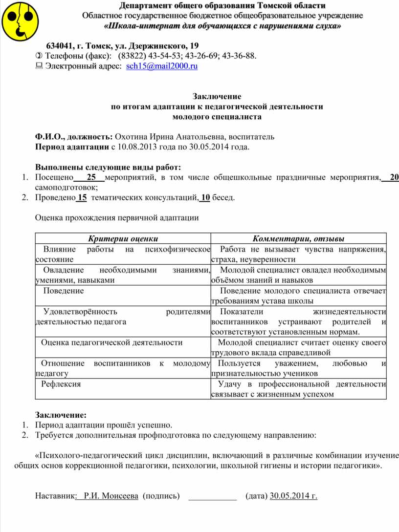 Мы определили совместную программу работы начинающего педагога с наставником. Раиса Ивановна оказала помощь в составлении календарно-тематического плана, в организации совместной и свободной деятельности младших школьников с нарушениями слуха. Провела консультации по подбору литературы, предложила примерные темы по самообразованию, провела анализ того, как спланировать работу над методической темой на год. В течение года я посещала уроки, режимные моменты, проводила беседы, осуществляла подробный анализ, училась организовывать учебно-воспитательный процесс, вести документацию; получила консультацию по работе в сети образовательных сайтов «Учительский сайт» проекта «Инфоурок» http://Учительский.сайт.