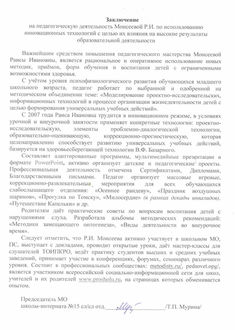 Под руководством моего наставника Моисеевой Раисы Ивановны, я получила опыт работы с детьми, имеющими нарушения в развитии сенсорной сферы. В первую очередь Раиса Ивановна обратила моё внимание на требования к организации учебно-воспитательного процесса; к ведению документации. Познакомила с теорией дифференцированного обучения, механизмом использования дидактического, наглядного и других материалов с целью обходного пути развития детей с нарушениями слуха.