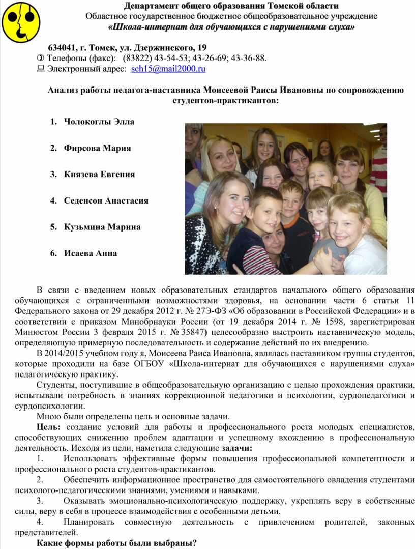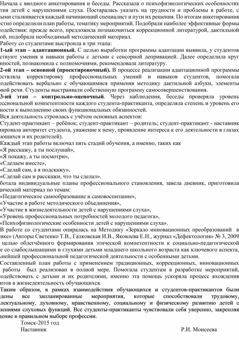 В 2014/2015 учебном году я, Моисеева Раиса Ивановна, являлась наставником группы студентов, которые проходили на базе ОГБОУ «Школа-интернат для обучающихся с нарушениями слуха» педагогическую практику.
