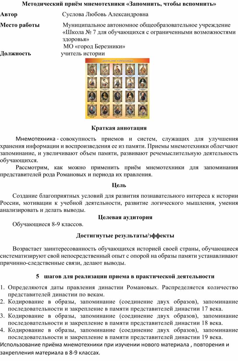 2. Кодирование в образы, запоминание (соединение двух образов), запоминание последовательности и закрепление в памяти представителей династии 17 века.