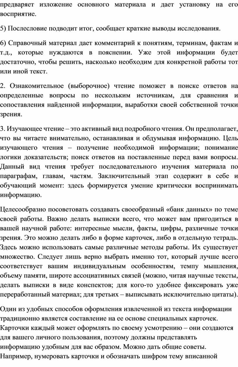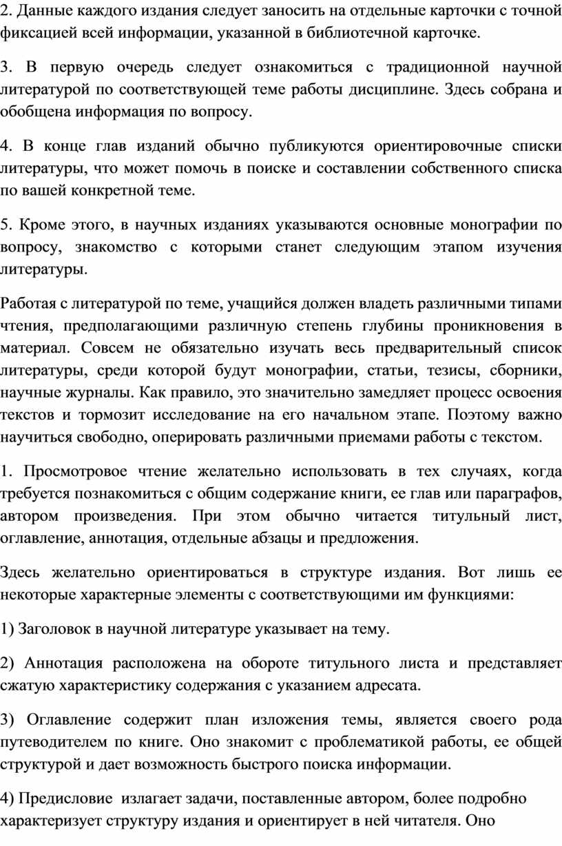 Работая с литературой по теме, учащийся должен владеть различными типами чтения, предполагающими различную степень глубины проникновения в материал. Совсем не обязательно изучать весь предварительный список литературы, среди которой будут монографии, статьи, тезисы, сборники, научные журналы. Как правило, это значительно замедляет процесс освоения текстов и тормозит исследование на его начальном этапе. Поэтому важно научиться свободно, оперировать различными приемами работы с текстом.