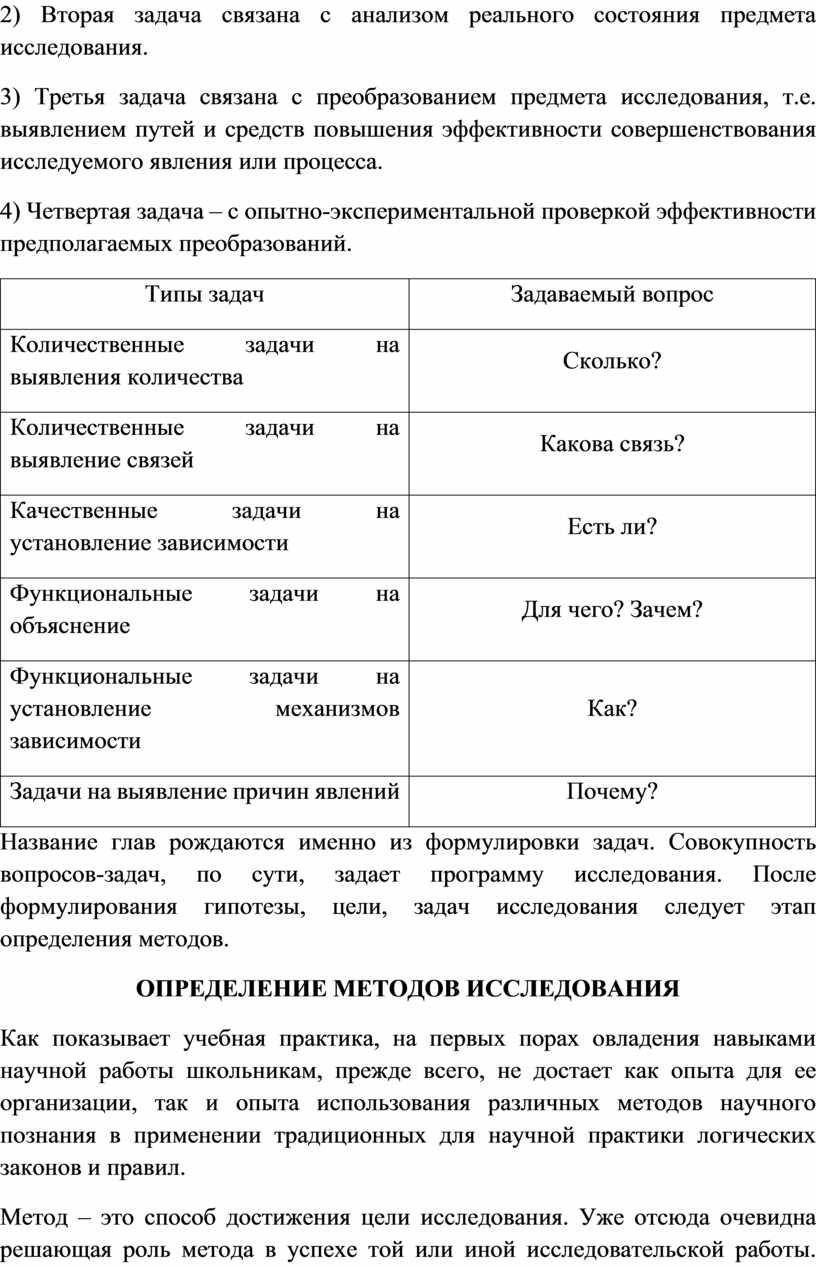 Название глав рождаются именно из формулировки задач. Совокупность вопросов-задач, по сути, задает программу исследования. После формулирования гипотезы, цели, задач исследования следует этап определения методов.