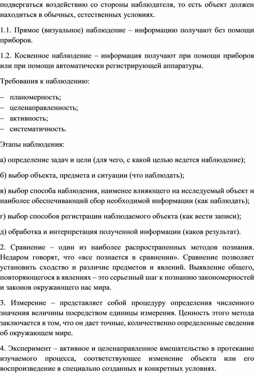 1. Наблюдение – целенаправленное восприятие какого-либо явления, в процессе которого исследовать получает конкретный фактический материал. При этом ведутся записи (протоколы) наблюдений. Наблюдение проводится обычно по заранее намеченному плану с выделением конкретных объектов наблюдения. Суть его состоит в том, что изучаемый объект не должен подвергаться воздействию со стороны наблюдателя, то есть объект должен находиться в обычных, естественных условиях.