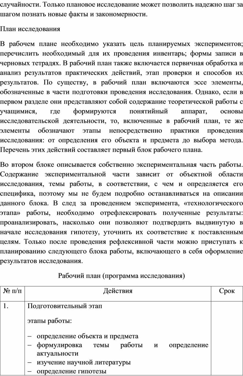 В рабочем плане необходимо указать цель планируемых экспериментов; перечислить необходимый для их проведения инвентарь; формы записи в черновых тетрадях. В рабочий план также включается первичная обработка и анализ результатов практических действий, этап проверки и способов их результатов. По существу, в рабочий план включаются эссе элементы, обозначенные в части подготовки проведения исследования. Однако, если в первом разделе они представляют собой содержание теоретической работы с учащимися, где формируются понятийный аппарат, основы исследовательской деятельности, то, включенные в рабочий план, те же элементы обозначают этапы непосредственно практики проведения исследования: от определения его объекта и предмета до выбора метода. Перечень этих действий составляет первый блок рабочего плана.