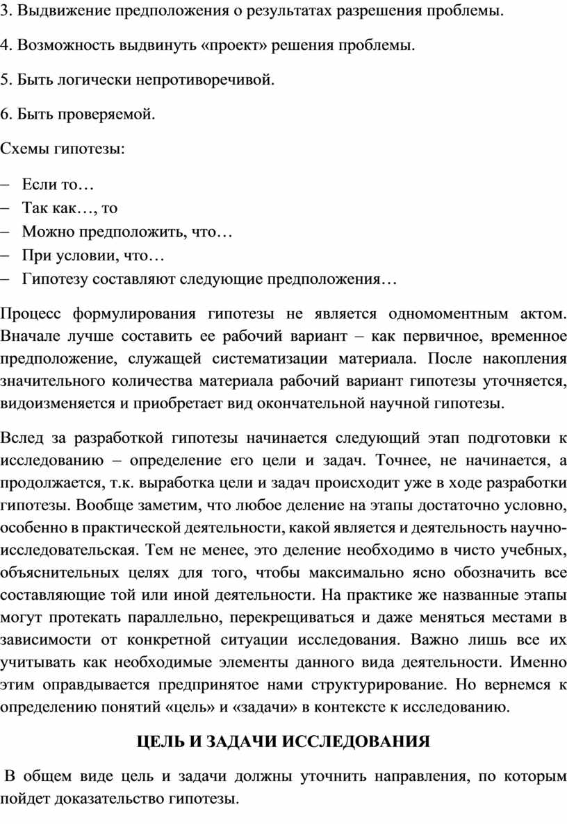 Вслед за разработкой гипотезы начинается следующий этап подготовки к исследованию – определение его цели и задач. Точнее, не начинается, а продолжается, т.к. выработка цели и задач происходит уже в ходе разработки гипотезы. Вообще заметим, что любое деление на этапы достаточно условно, особенно в практической деятельности, какой является и деятельность научно-исследовательская. Тем не менее, это деление необходимо в чисто учебных, объяснительных целях для того, чтобы максимально ясно обозначить все составляющие той или иной деятельности. На практике же названные этапы могут протекать параллельно, перекрещиваться и даже меняться местами в зависимости от конкретной ситуации исследования. Важно лишь все их учитывать как необходимые элементы данного вида деятельности. Именно этим оправдывается предпринятое нами структурирование. Но вернемся к определению понятий «цель» и «задачи» в контексте к исследованию.
