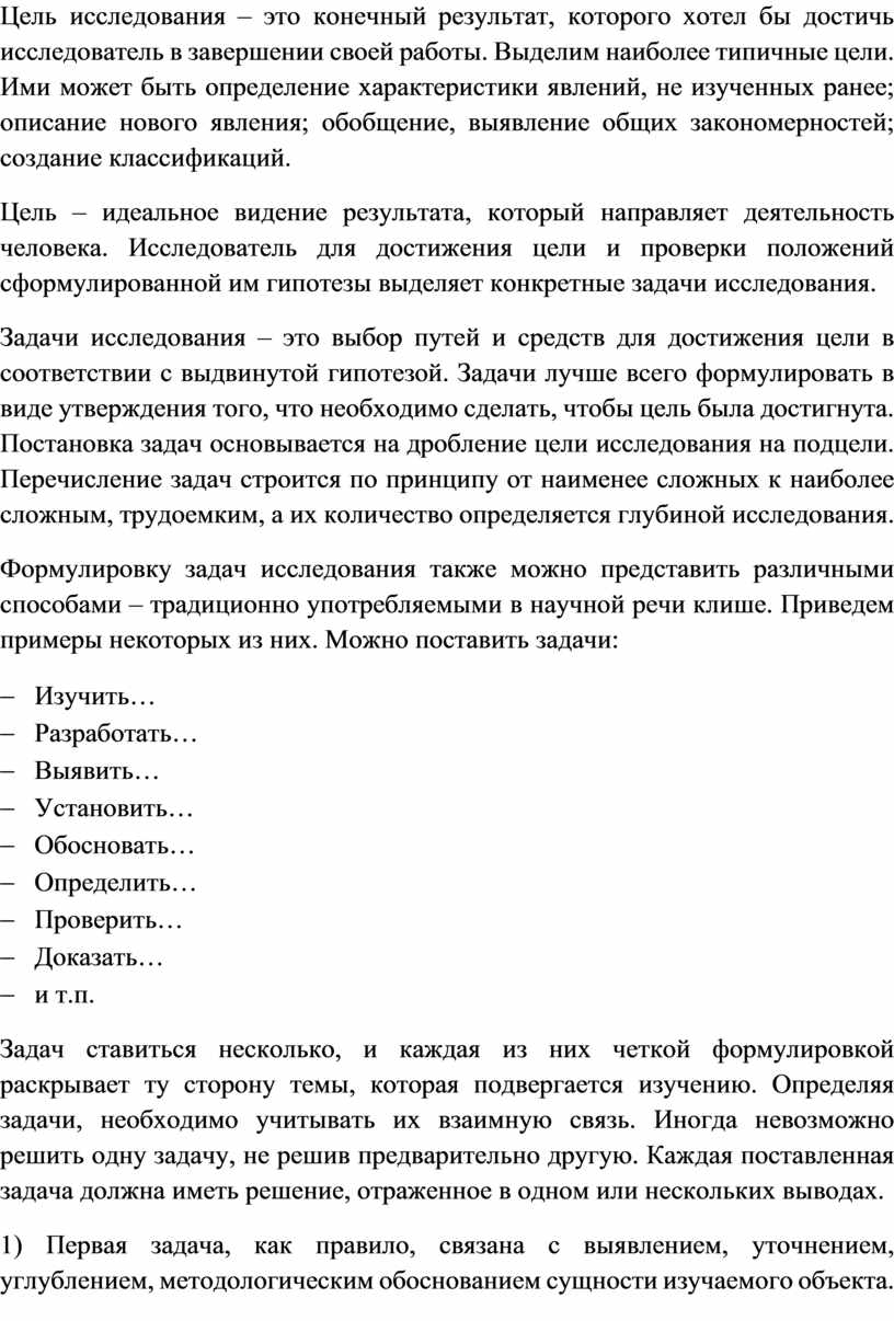 Задачи исследования – это выбор путей и средств для достижения цели в соответствии с выдвинутой гипотезой. Задачи лучше всего формулировать в виде утверждения того, что необходимо сделать, чтобы цель была достигнута. Постановка задач основывается на дробление цели исследования на подцели. Перечисление задач строится по принципу от наименее сложных к наиболее сложным, трудоемким, а их количество определяется глубиной исследования.