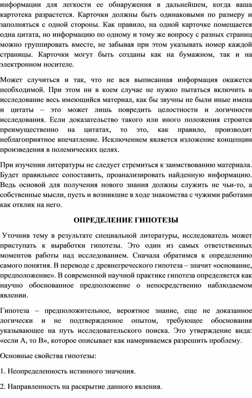 Может случиться и так, что не вся выписанная информация окажется необходимой. При этом ни в коем случае не нужно пытаться включить в исследование весь имеющийся материал, как бы звучны не были иные имена и цитаты – это может лишь повредить целостности и логичности исследования. Если доказательство такого или иного положения строится преимущественно на цитатах, то это, как правило, производит неблагоприятное впечатление. Исключением является изложение концепции произведения в полемических целях.