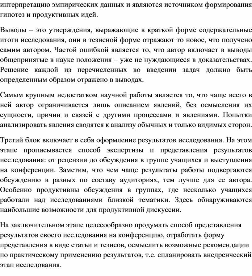 Третий блок включает в себя оформление результатов исследования. На этом этапе прописывается способ экспертизы и представления результатов исследования: от рецензии до обсуждения в группе учащихся и выступления на конференции. Заметим, что чем чаще результаты работы подвергаются обсуждению в разных по составу аудиториях, тем лучше для ее автора. Особенно продуктивны обсуждения в группах, где несколько учащихся работали над исследованиями близкой тематики. Здесь обнаруживаются наибольшие возможности для продуктивной дискуссии.