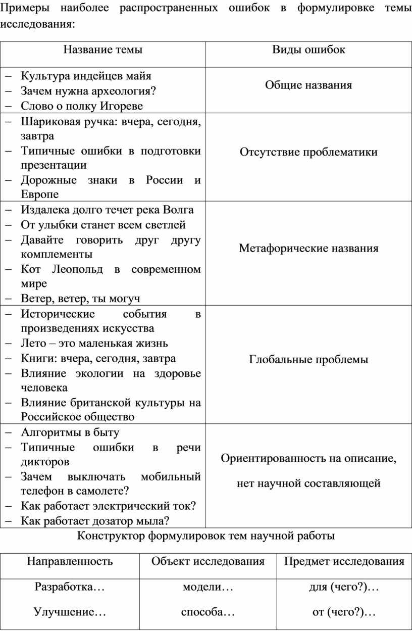 Примеры наиболее распространенных ошибок в формулировке темы исследования: