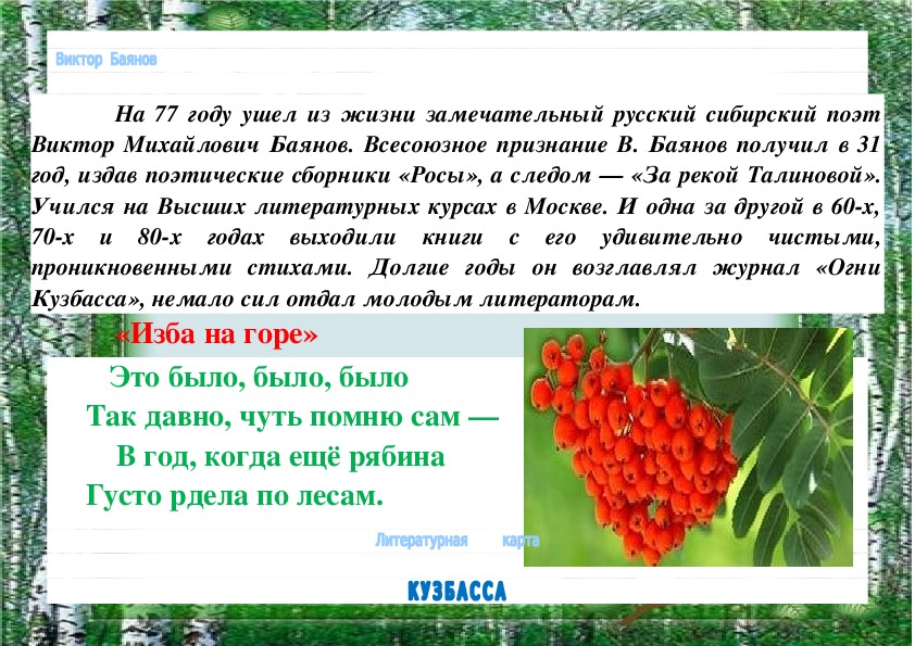 В данной работе я вам предлагаю материал по литературоведению Кузбасса. Этот материал может пригодится для оформления уголка "Литературный Кузбасс" или как региональный компонент на уроке литературы. Здесь же вы можете найти литературную карту Кузбасса, а также несколько красивейших строк о родной земле кузбасских поэтов.