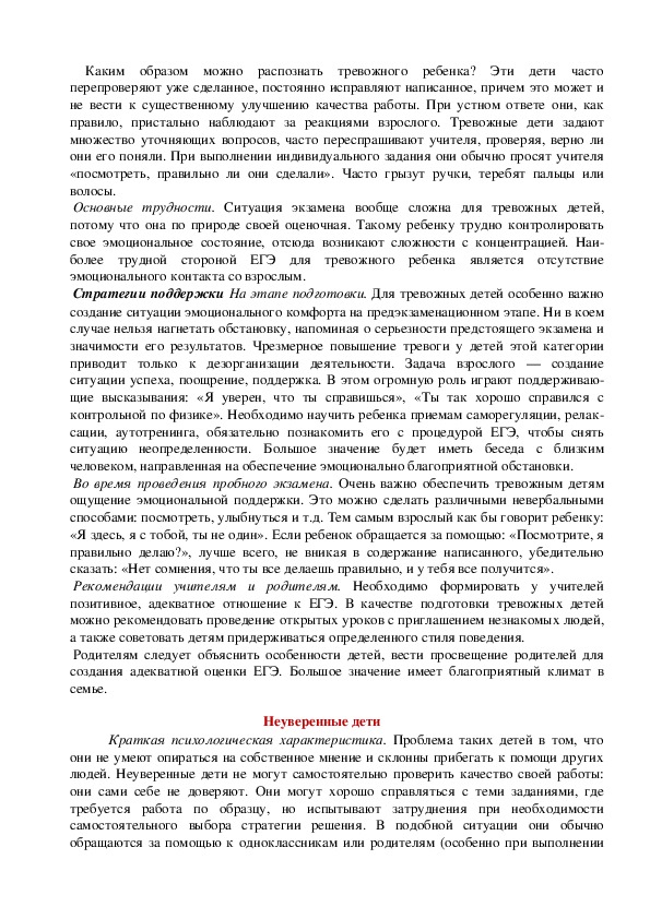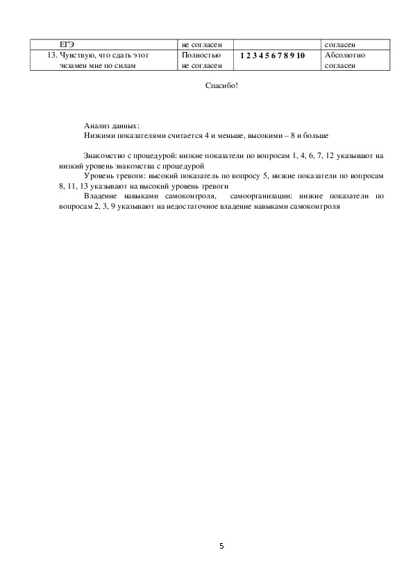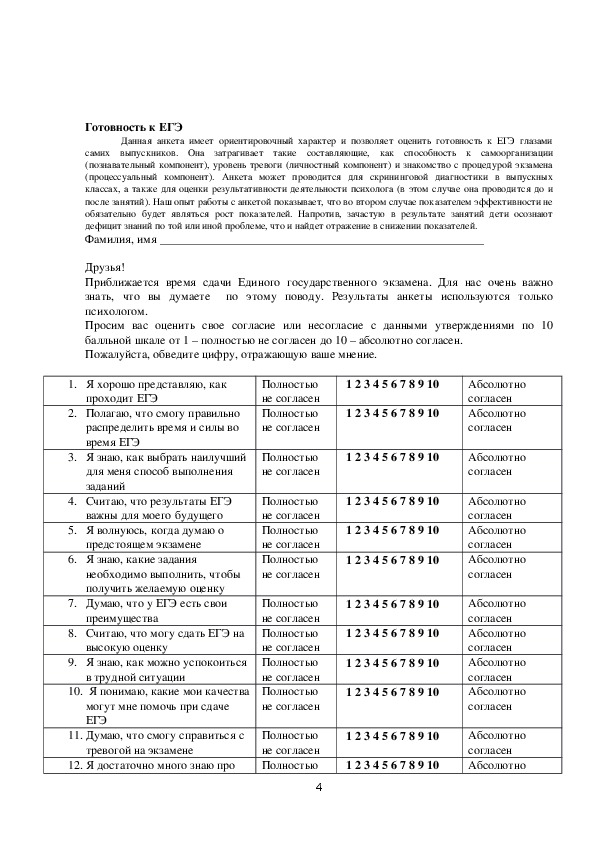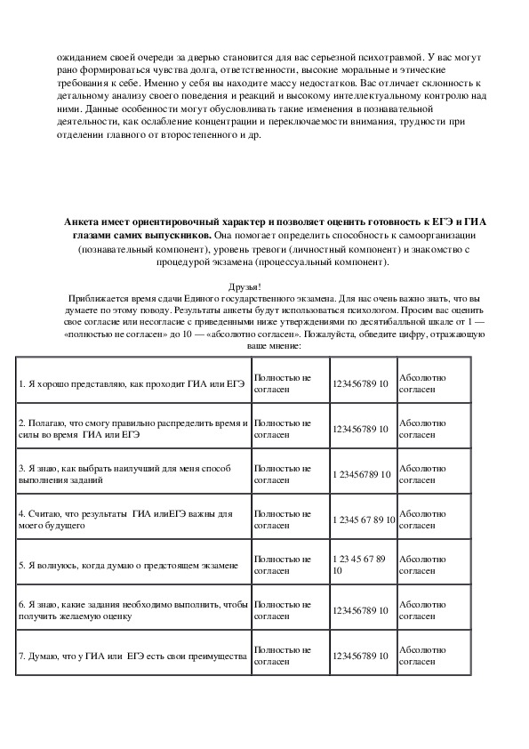 Данная анкета имеет ориентировочный характер и позволяет оценить готовность к ЕГЭ глазами