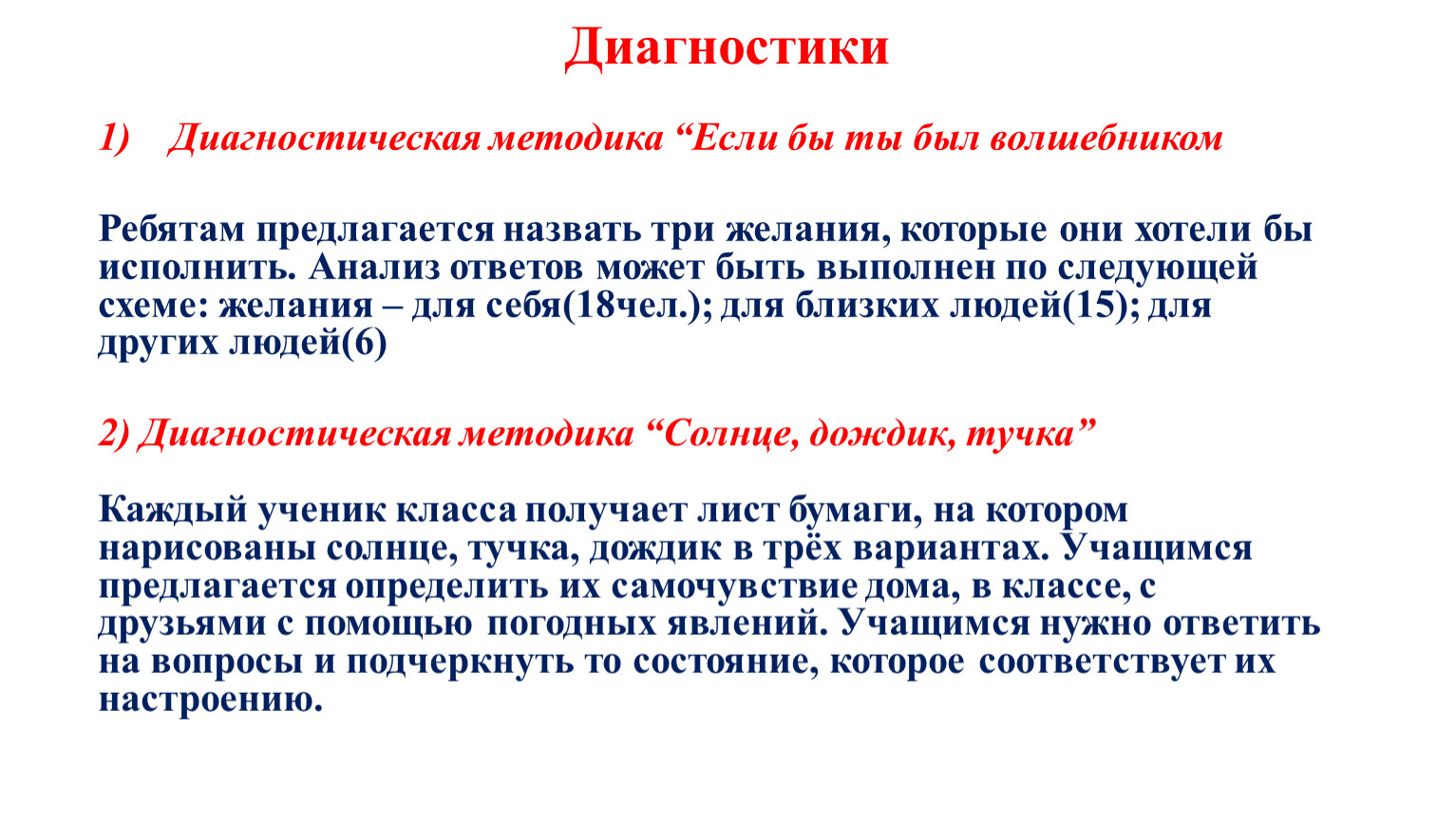 2) Диагностическая методика “Солнце, дождик, тучка”Каждый ученик класса получает лист бумаги, на котором нарисованы солнце, тучка, дождик в трёх вариантах. Учащимся предлагается определить их самочувствие дома, в классе, с друзьями с помощью погодных явлений. Учащимся нужно ответить на вопросы и подчеркнуть то состояние, которое соответствует их настроению.
