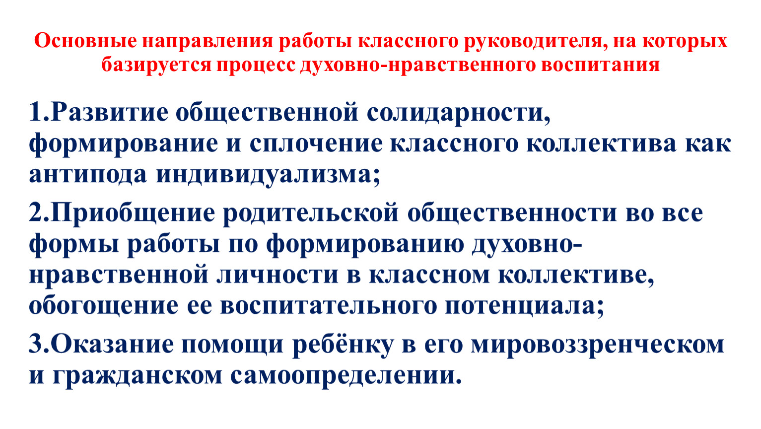 Основные направления работы классного руководителя, на которых базируется процесс духовно-нравственного воспитания