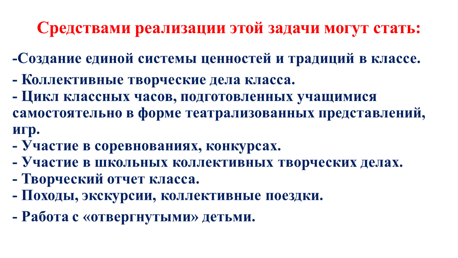 - Коллективные творческие дела класса.- Цикл классных часов, подготовленных учащимися самостоятельно в форме театрализованных представлений, игр.- Участие в соревнованиях, конкурсах.- Участие в школьных коллективных творческих делах.- Творческий отчет класса.- Походы, экскурсии, коллективные поездки.