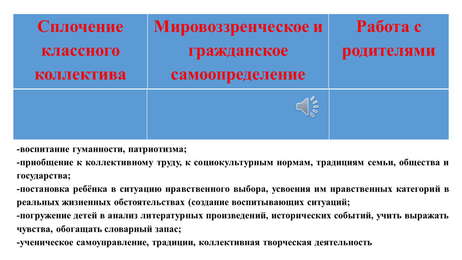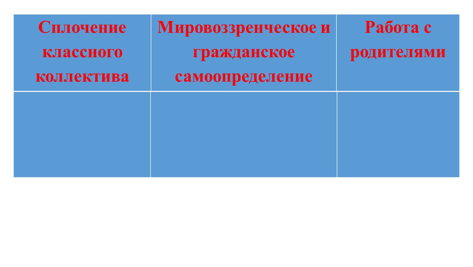 Сплочение классного коллектива | Мировоззренческое и гражданское самоопределение | Работа с родителями |