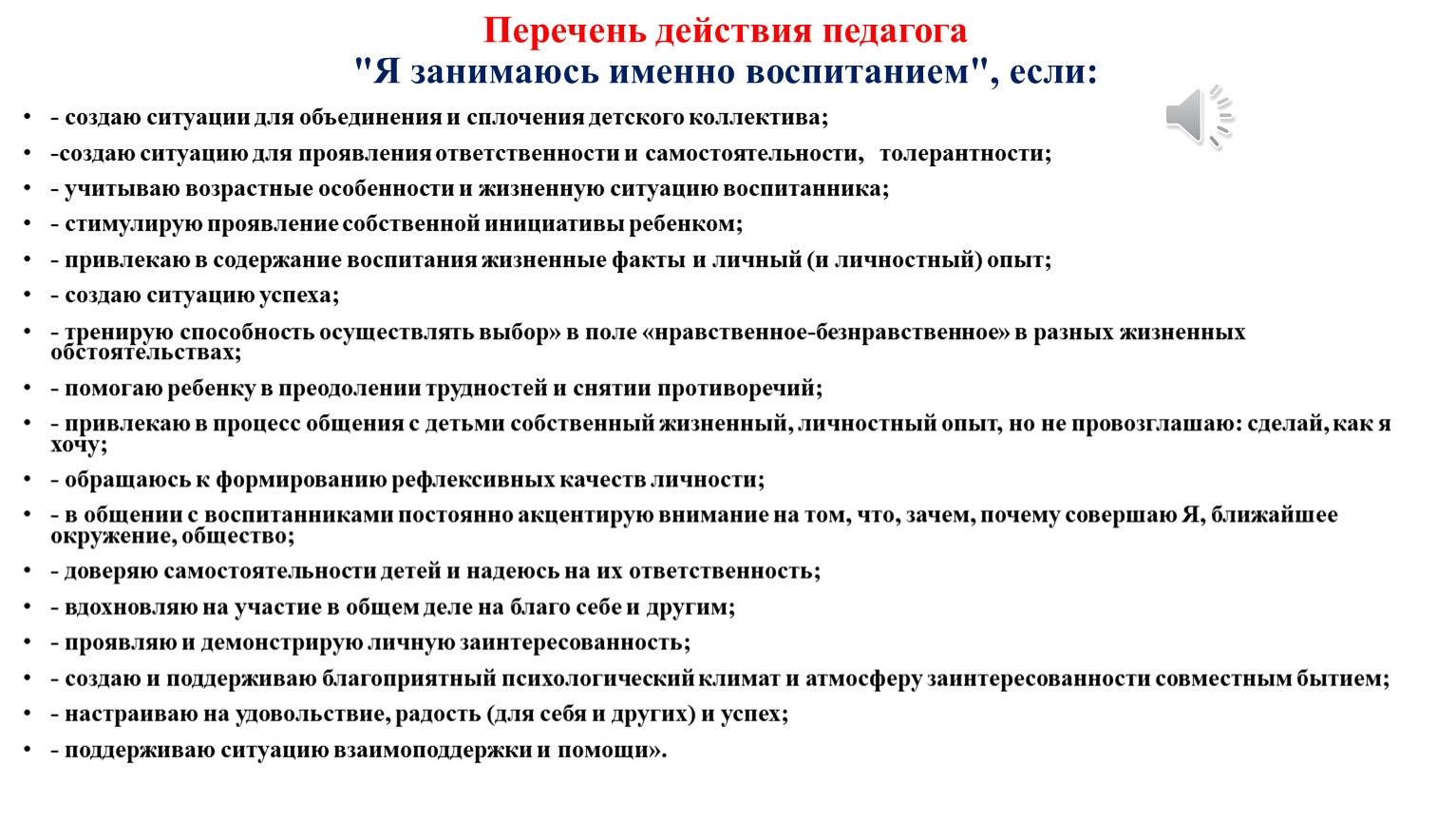 Перечень действия педагога"Я занимаюсь именно воспитанием", если: