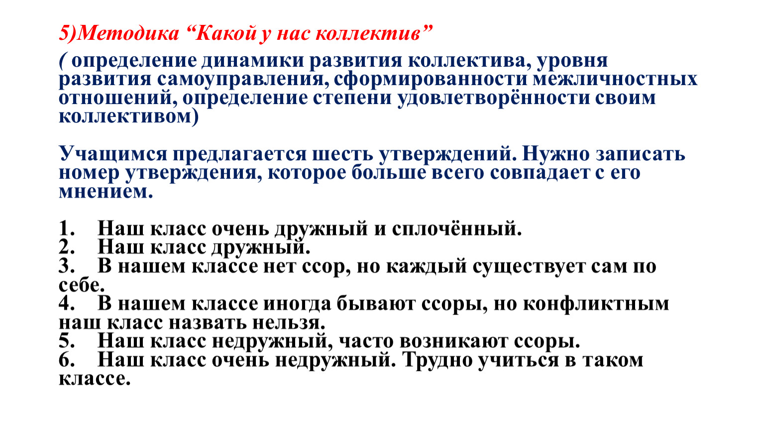 ( определение динамики развития коллектива, уровня развития самоуправления, сформированности межличностных отношений, определение степени удовлетворённости своим коллективом) Учащимся предлагается шесть утверждений. Нужно записать номер утверждения, которое больше всего совпадает с его мнением. 1. Наш класс очень дружный и сплочённый.2. Наш класс дружный.3. В нашем классе нет ссор, но каждый существует сам по себе.4. В нашем классе иногда бывают ссоры, но конфликтным наш класс назвать нельзя.5. Наш класс недружный, часто возникают ссоры.6. Наш класс очень недружный. Трудно учиться в таком классе.