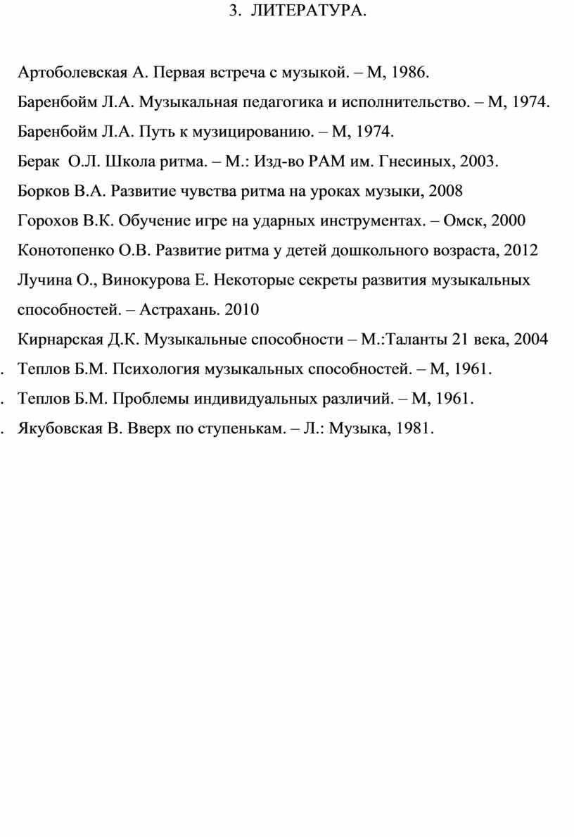 10. Теплов Б.М. Психология музыкальных способностей. – М, 1961.