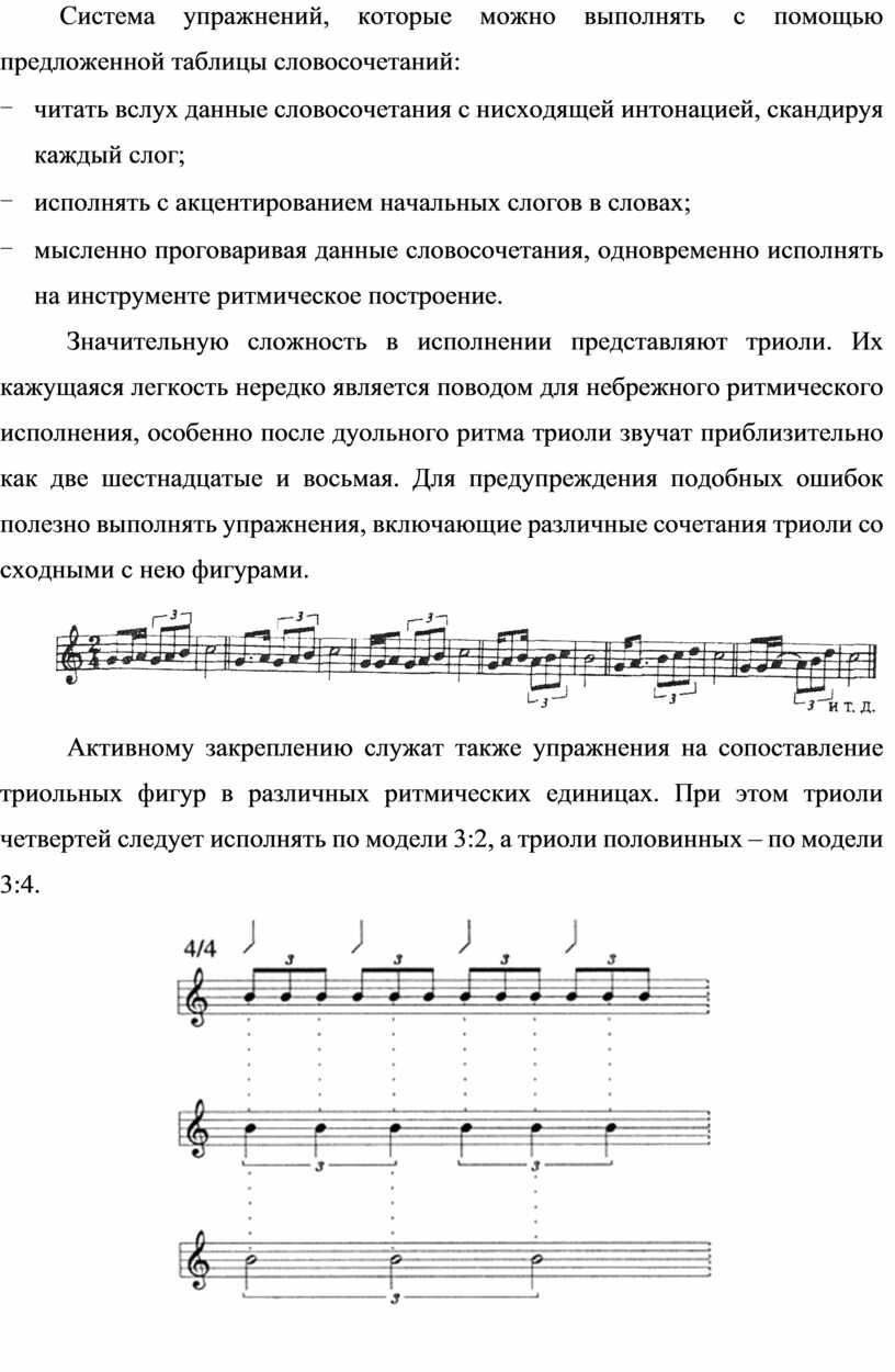 Активному закреплению служат также упражнения на сопоставление триольных фигур в различных ритмических единицах. При этом триоли четвертей следует исполнять по модели 3:2, а триоли половинных – по модели 3:4.