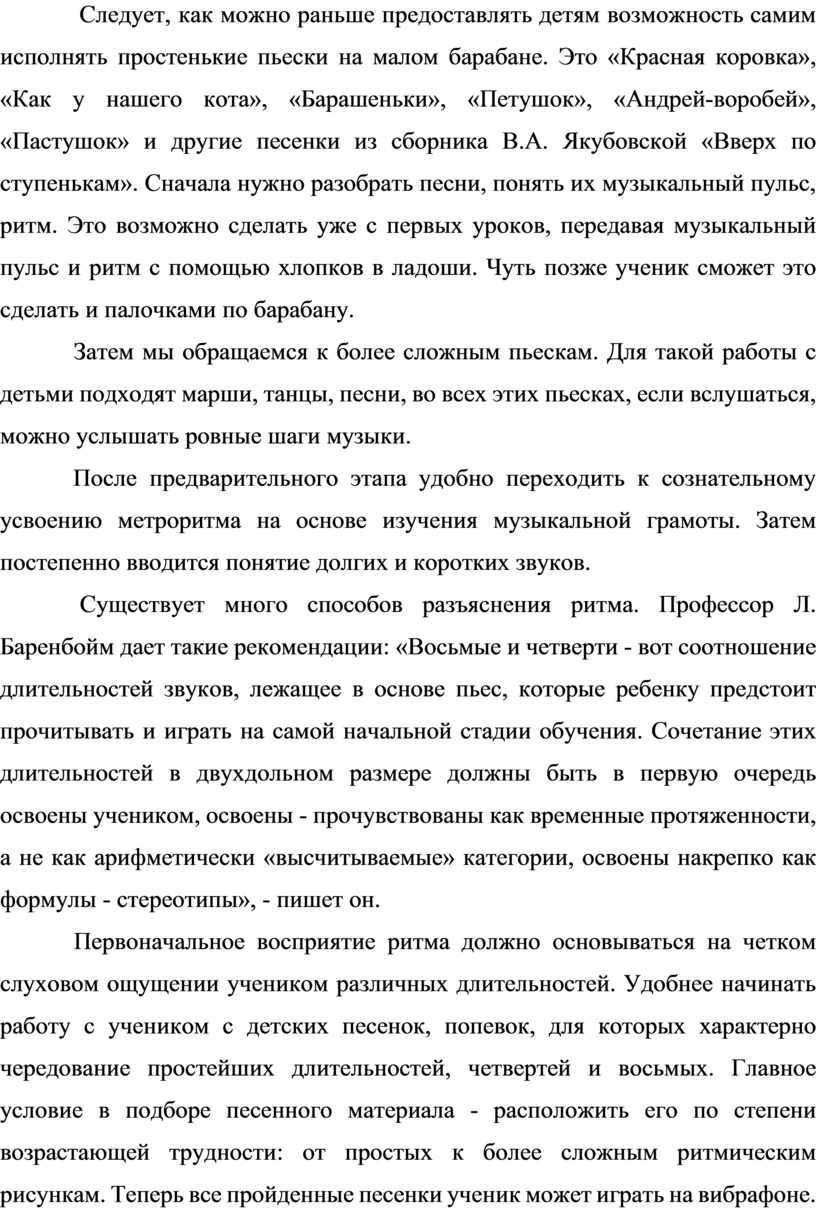 Следует, как можно раньше предоставлять детям возможность самим исполнять простенькие пьески на малом барабане. Это «Красная коровка», «Как у нашего кота», «Барашеньки», «Петушок», «Андрей-воробей», «Пастушок» и другие песенки из сборника В.А. Якубовской «Вверх по ступенькам». Сначала нужно разобрать песни, понять их музыкальный пульс, ритм. Это возможно сделать уже с первых уроков, передавая музыкальный пульс и ритм с помощью хлопков в ладоши. Чуть позже ученик сможет это сделать и палочками по барабану.