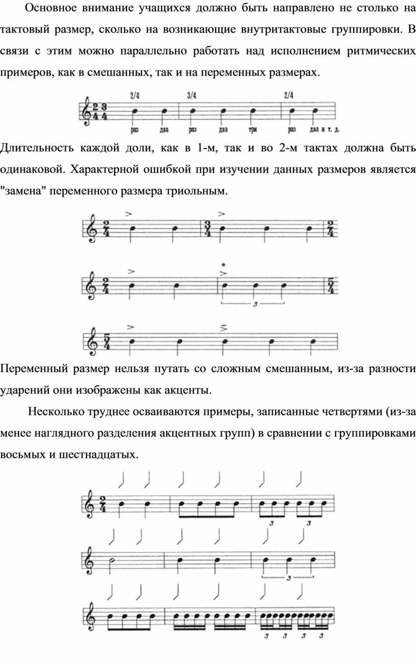 Основное внимание учащихся должно быть направлено не столько на тактовый размер, сколько на возникающие внутритактовые группировки. В связи с этим можно параллельно работать над исполнением ритмических примеров, как в смешанных, так и на переменных размерах.