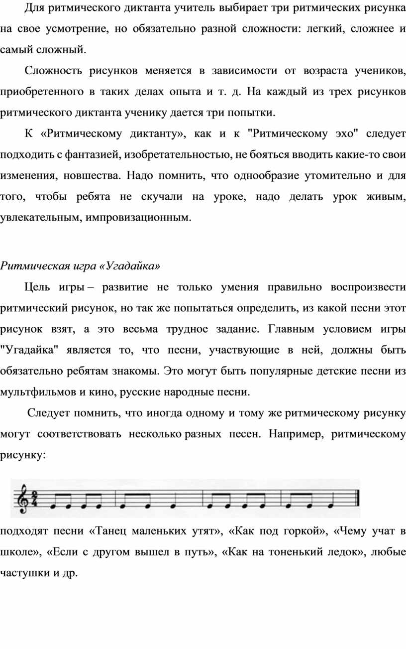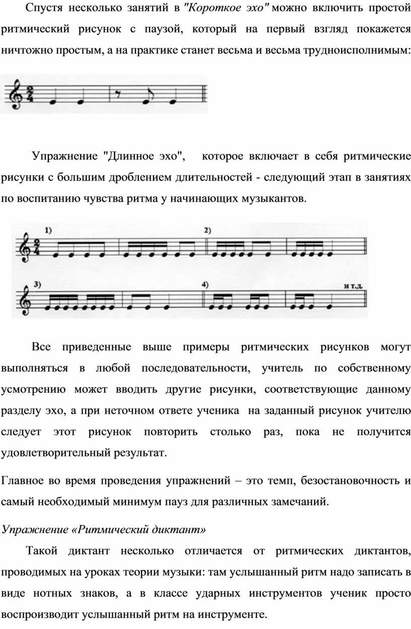 Все приведенные выше примеры ритмических рисунков могут выполняться в любой последовательности, учитель по собственному усмотрению может вводить другие рисунки, соответствующие данному разделу эхо, а при неточном ответе ученика на заданный рисунок учителю следует этот рисунок повторить столько раз, пока не получится удовлетворительный результат.
