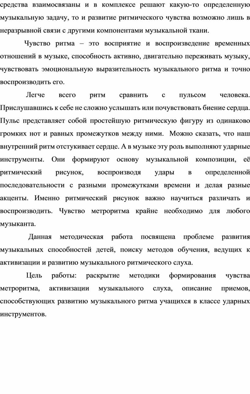 Цель работы: раскрытие методики формирования чувства метроритма, активизации музыкального слуха, описание приемов, способствующих развитию музыкального ритма учащихся в классе ударных инструментов.