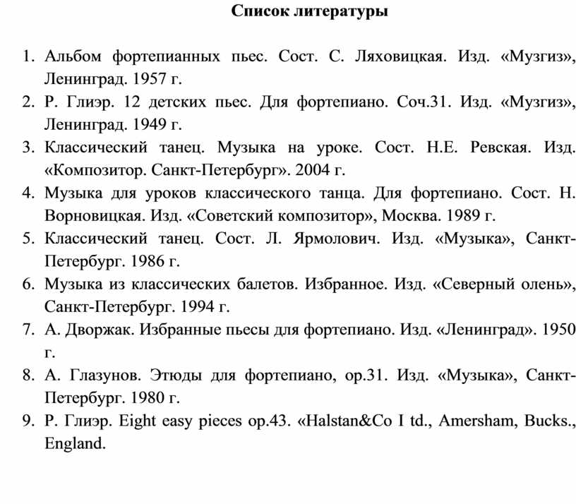 4. Музыка для уроков классического танца. Для фортепиано. Сост. Н. Ворновицкая. Изд. «Советский композитор», Москва. 1989 г.