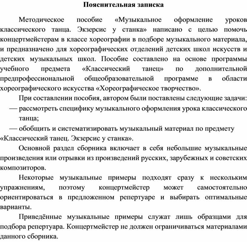 Методическое пособие «Музыкальное оформление уроков классического танца. Экзерсис у станка» написано с целью помочь концертмейстерам в классе хореографии в подборе музыкального материала, и предназначено для хореографических отделений детских школ искусств и детских музыкальных школ. Пособие составлено на основе программы учебного предмета «Классический танец» по дополнительной предпрофессиональной общеобразовательной программе в области хореографического искусства «Хореографическое творчество».