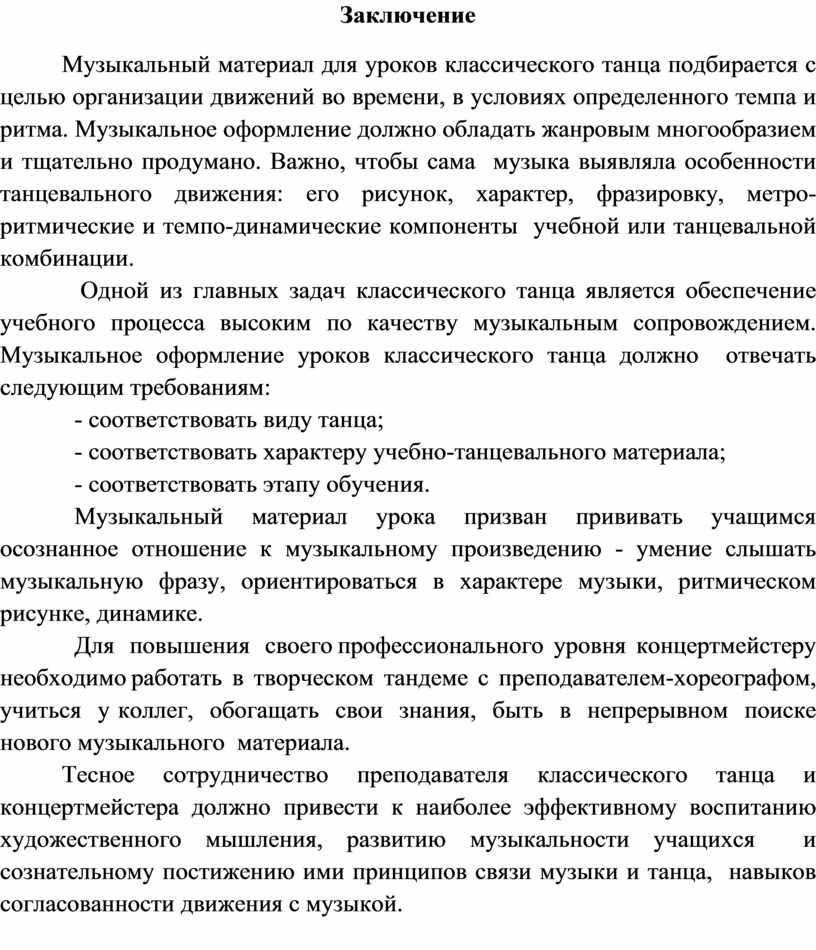 Одной из главных задач классического танца является обеспечение учебного процесса высоким по качеству музыкальным сопровождением. Музыкальное оформление уроков классического танца должно отвечать следующим требованиям:
