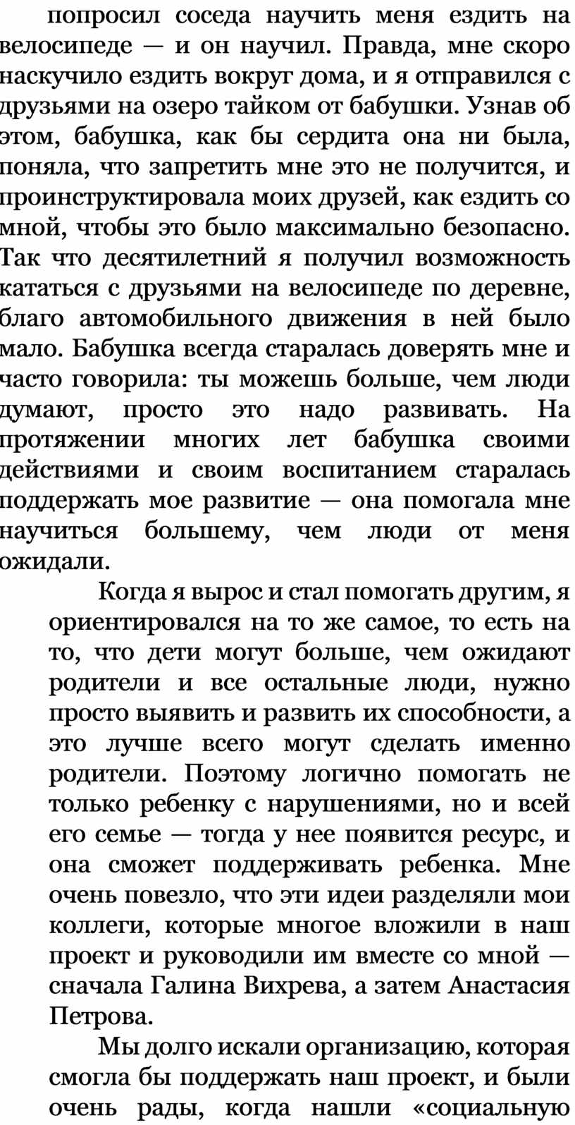 Мы выражаем благодарность немецкому фонду «Акция-Человек» (Aktion Mench), организации «Перспективы» в Германии (PERSPEKTIVENe. V), ЧОУ ДПО «Социальная школа Каритас» за поддержку проекта, а также лично Ларисе Косулиной, Марии Беркович, Радику Галияхметову, Наталье Минибаевой, Илье Федорову и Ольге Герасименко за содействие в создании книги.