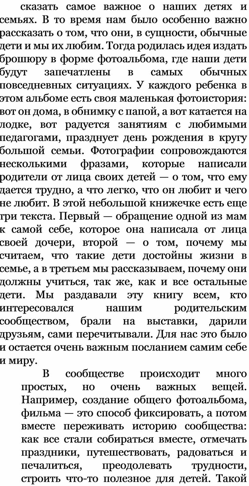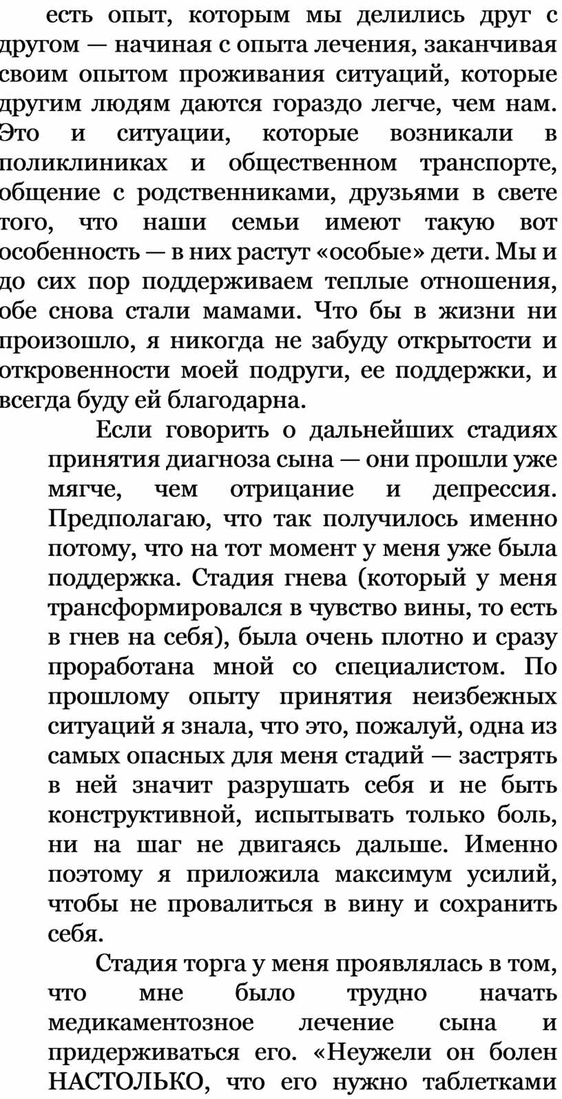 Одни из вас были одинокими людьми, другие имели большие и дружные семьи, одни посвящали себя уходу за ребенком, другие были руководителями организаций, бухгалтерами, психологами, таксистами. Каждый человек оказывался обладателем такого разного спектра занятий, профессий, ресурсов, взглядов на жизнь. И тот факт, что ваш ребенок «особый», не мог сделать вас похожими. К тому же в зависимости от возраста ваших детей, типа и степени нарушений их развития, среды, в которой они живут, «особенность» ребенка всегда имела разный смысл. Это помогло развенчать внутренний миф о том, что группа родителей людей с особыми потребностями — это сообщество с одинаковыми проблемами, вопросами и характеристиками. Так, обобщенное понятие «родители детей с особенностями развития» для меня перестало быть однородным.