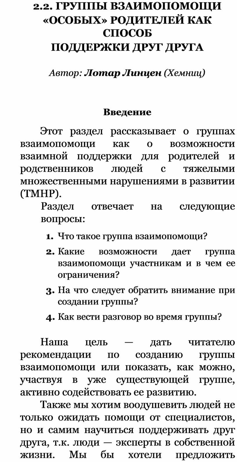 2.2. Лотар Линцен. Группы взаимопомощи «особых»