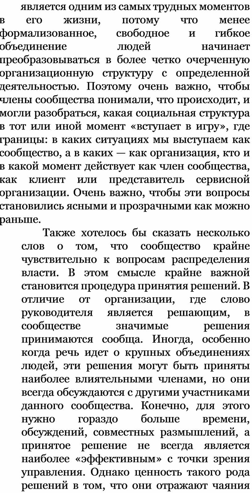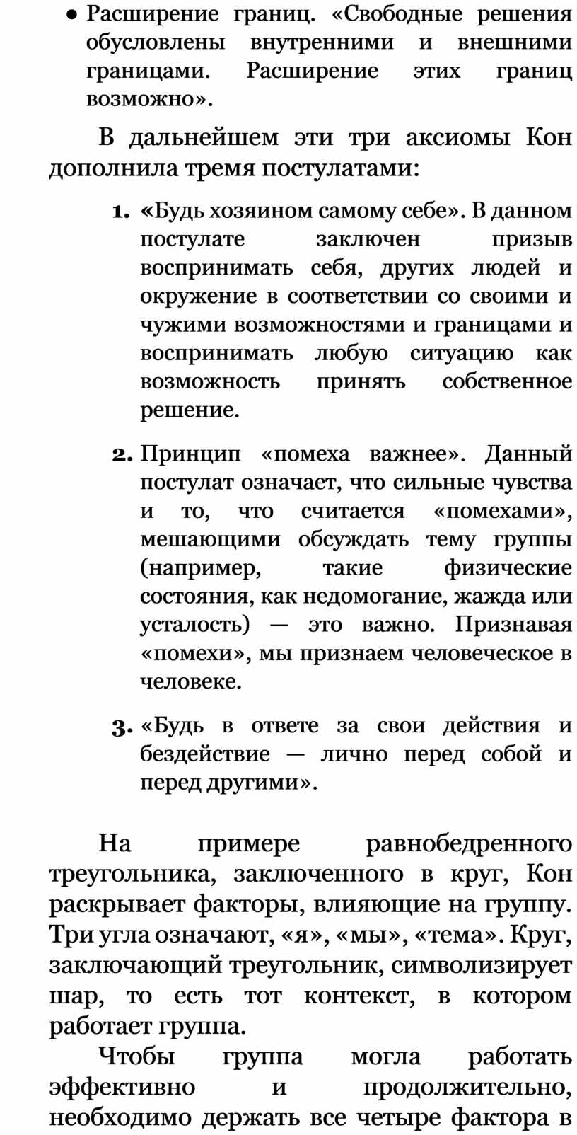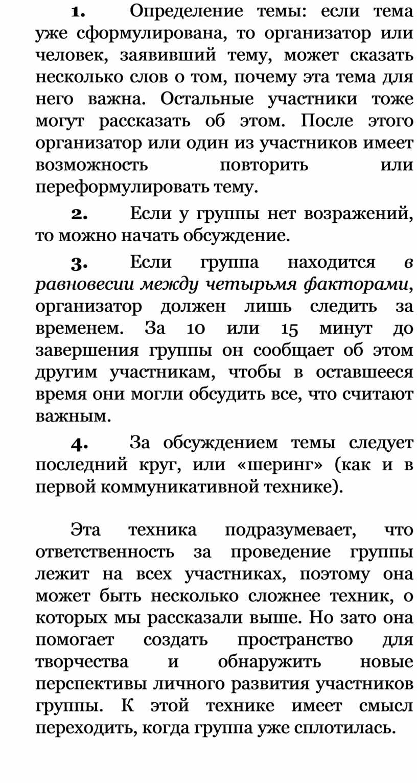 4. Если группа находится в равновесии между четырьмя факторами, (см. стр. 42) организатор должен лишь следить за временем. За 10 или 15 минут до завершения группы он сообщает об этом другим участникам, чтобы в оставшееся время они могли обсудить все, что считают важным.