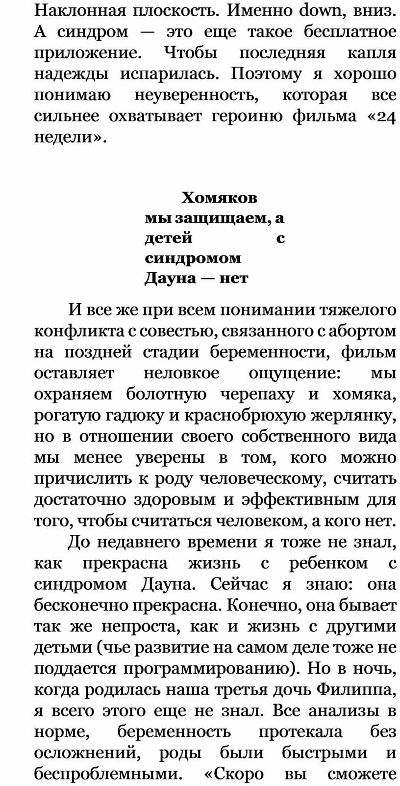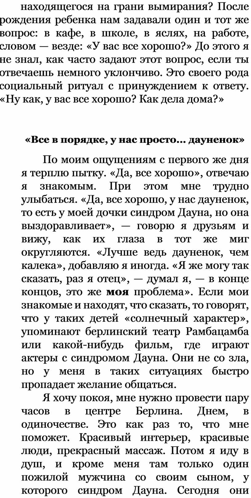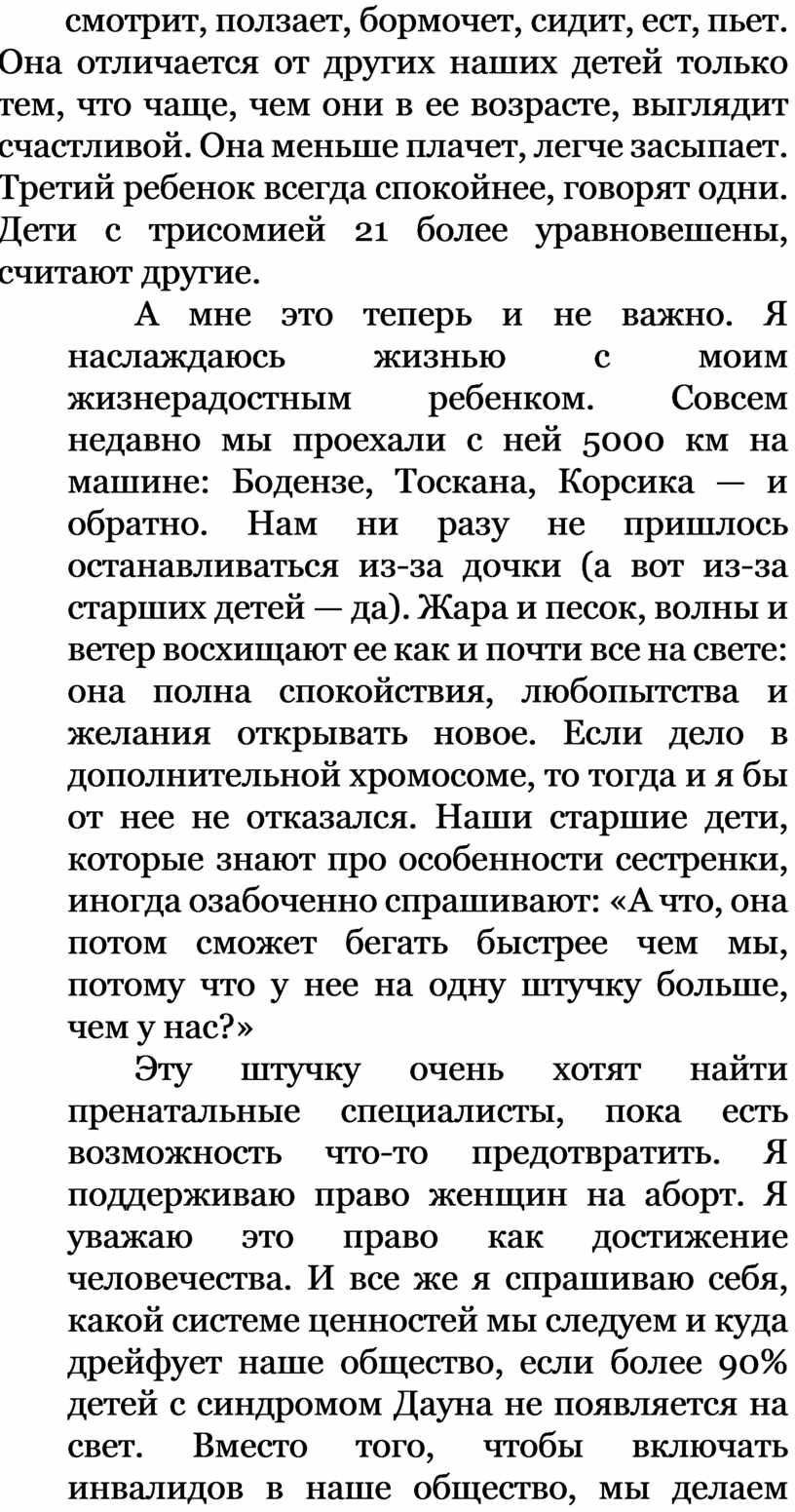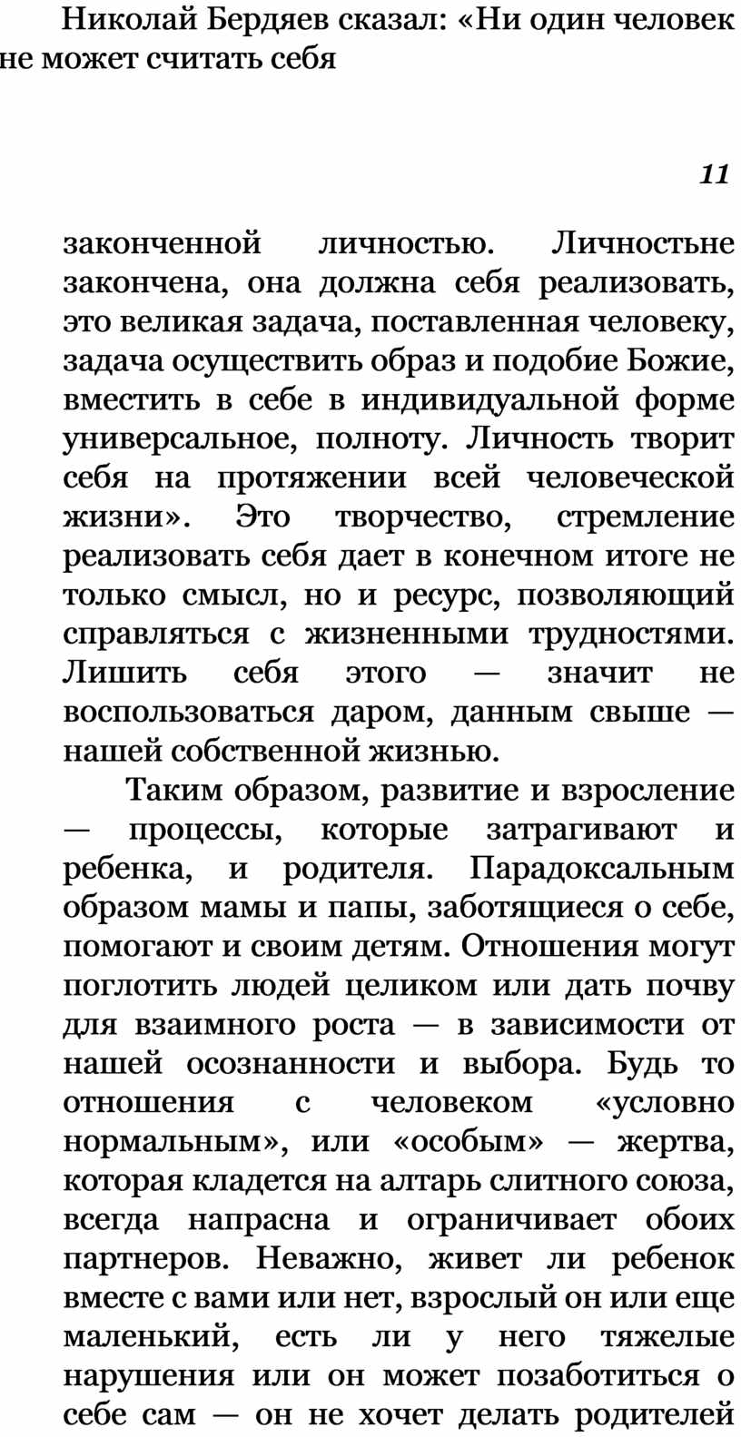 Таким образом, развитие и взросление — процессы, которые затрагивают и ребенка, и родителя. Парадоксальным образом мамы и папы, заботящиеся о себе, помогают и своим детям. Отношения могут поглотить людей целиком или дать почву для взаимного роста — в зависимости от нашей осознанности и выбора. Будь то отношения с человеком «условно нормальным», или «особым» — жертва, которая кладется на алтарь слитного союза, всегда напрасна и ограничивает обоих партнеров. Неважно, живет ли ребенок вместе с вами или нет, взрослый он или еще маленький, есть ли у него тяжелые нарушения или он может позаботиться о себе сам — он не хочет делать родителей несчастными. Когда я вижу родителей, живущих полноценной жизнью, я спокойна за будущее их ребенка. Я вижу не особых, но особенных детей и их особенных родителей: самобытных, целостных, разных. Это наполняет меня чувством радости и полноты жизни, главное свойство которой — расширяющееся многообразие.