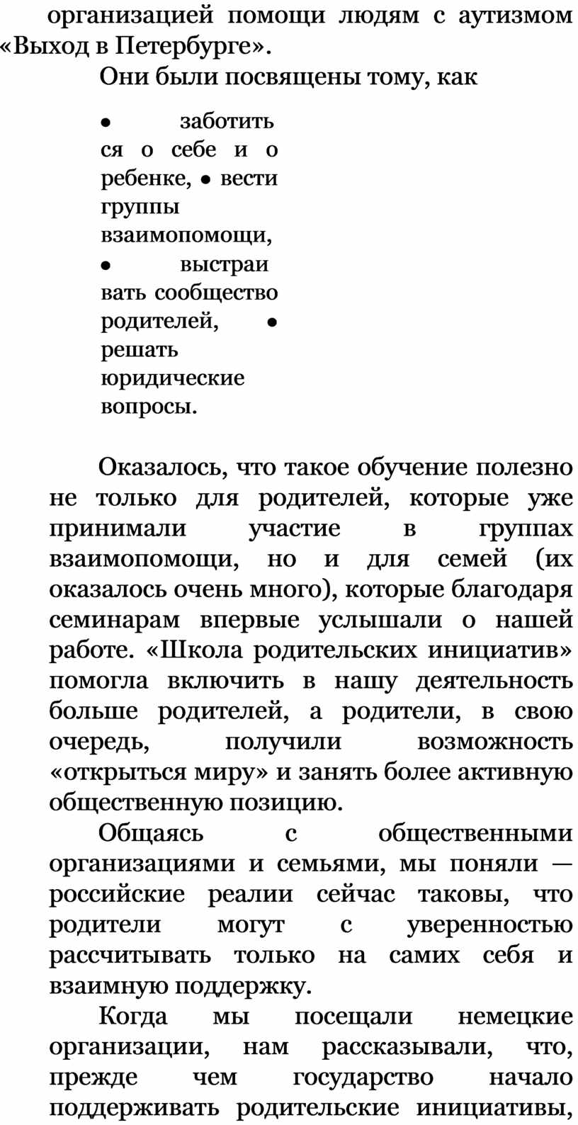 Сборник статей, который вы держите в руках, является продолжением и следствием нашей работы на протяжении двух лет. Книга призвана распространить сведения о том, как можно поддерживать самих себя и друг друга, каким образом родители могут объединяться для решения общих задач. Мы включили в нее личные истории родителей, описание способов организации и проведения групп взаимопомощи и опыт московской родительской организации «Дорога в мир». Поскольку забота родителей о себе зачастую сильно зависит от того, насколько обеспечен всем необходимым и самостоятелен их ребенок, мы посчитали важным включить в сборник