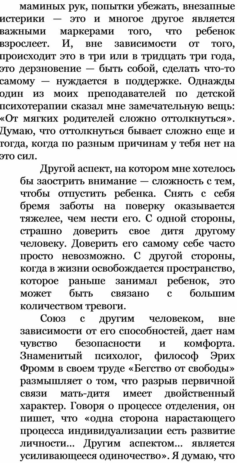 Союз с другим человеком, вне зависимости от его способностей, дает нам чувство безопасности и комфорта. Знаменитый психолог, философ Эрих Фромм в своем труде «Бегство от свободы» размышляет о том, что разрыв первичной связи мать-дитя имеет двойственный характер. Говоря о процессе отделения, он пишет, что «одна сторона нарастающего процесса индивидуализации есть развитие личности… Другим аспектом… является усиливающееся одиночество». Я думаю, что это справедливо как для ребенка, так и для родителя. Пустота, образующаяся от разрыва связи, должна быть заполнена своей жизнью.