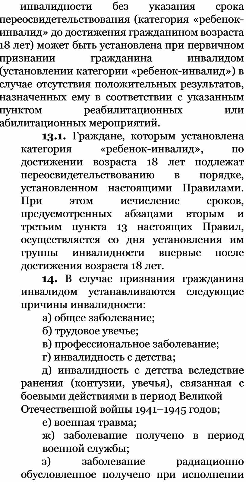 39. Переосвидетельствование инвалидов I группы проводится 1 раз в 2 года, инвалидов II и III групп — 1 раз в год, а детей-инвалидов — 1 раз в течение срока, на который ребенку установлена категория «ребенок-инвалид».