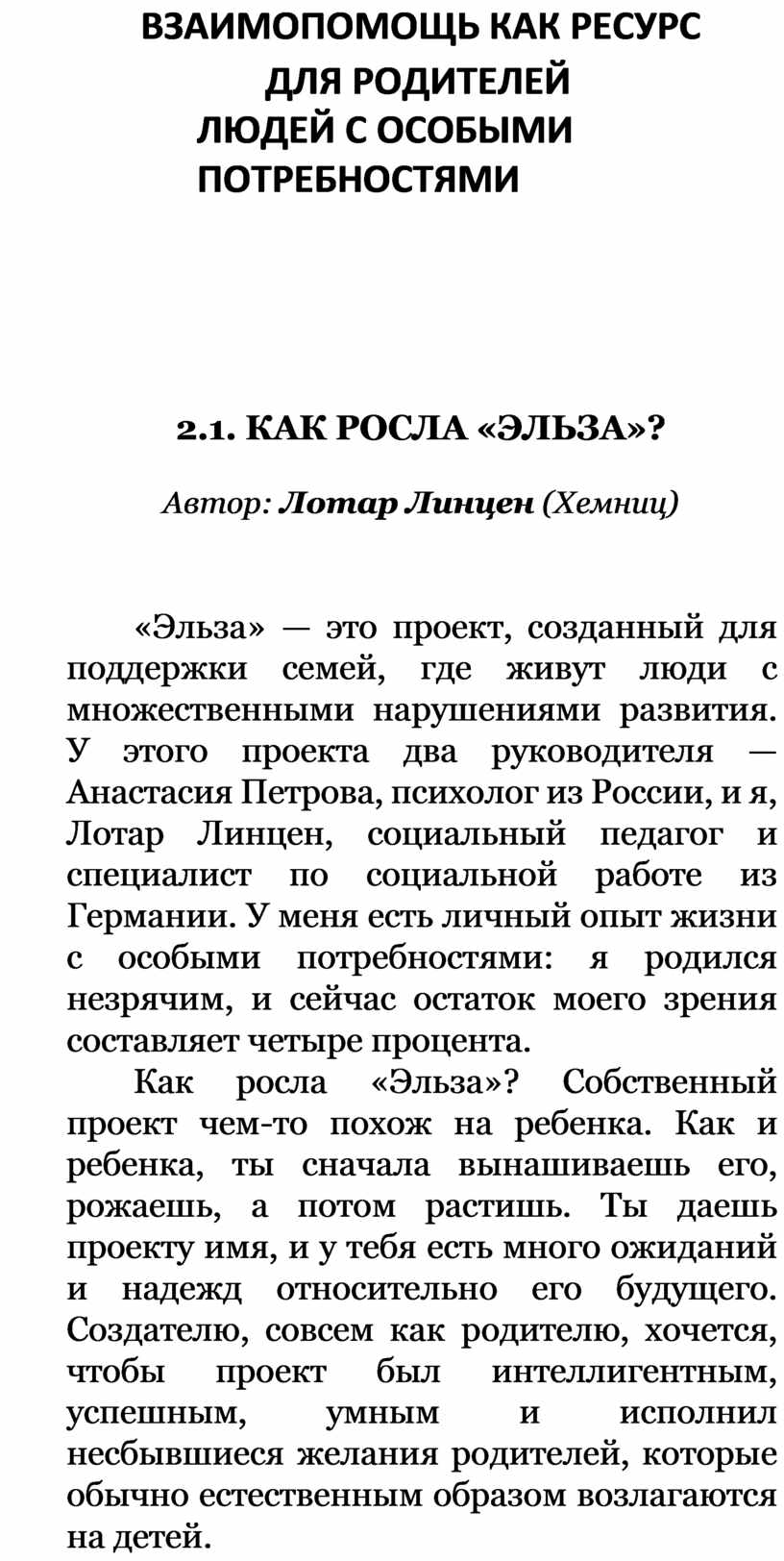 Эта книга является частью проекта «Эльза», который берет свое начало с 2015 года. Именно тогда у нескольких специалистов, работающих в области помощи людям с тяжелыми множественными нарушениями развития, возникла идея оказывать дополнительную поддержку родным и близким таких людей. Было решено создать первую группу взаимопомощи. Эта группа стала основой для написания целого проекта по развитию взаимопомощи среди родителей людей с особыми потребностями.