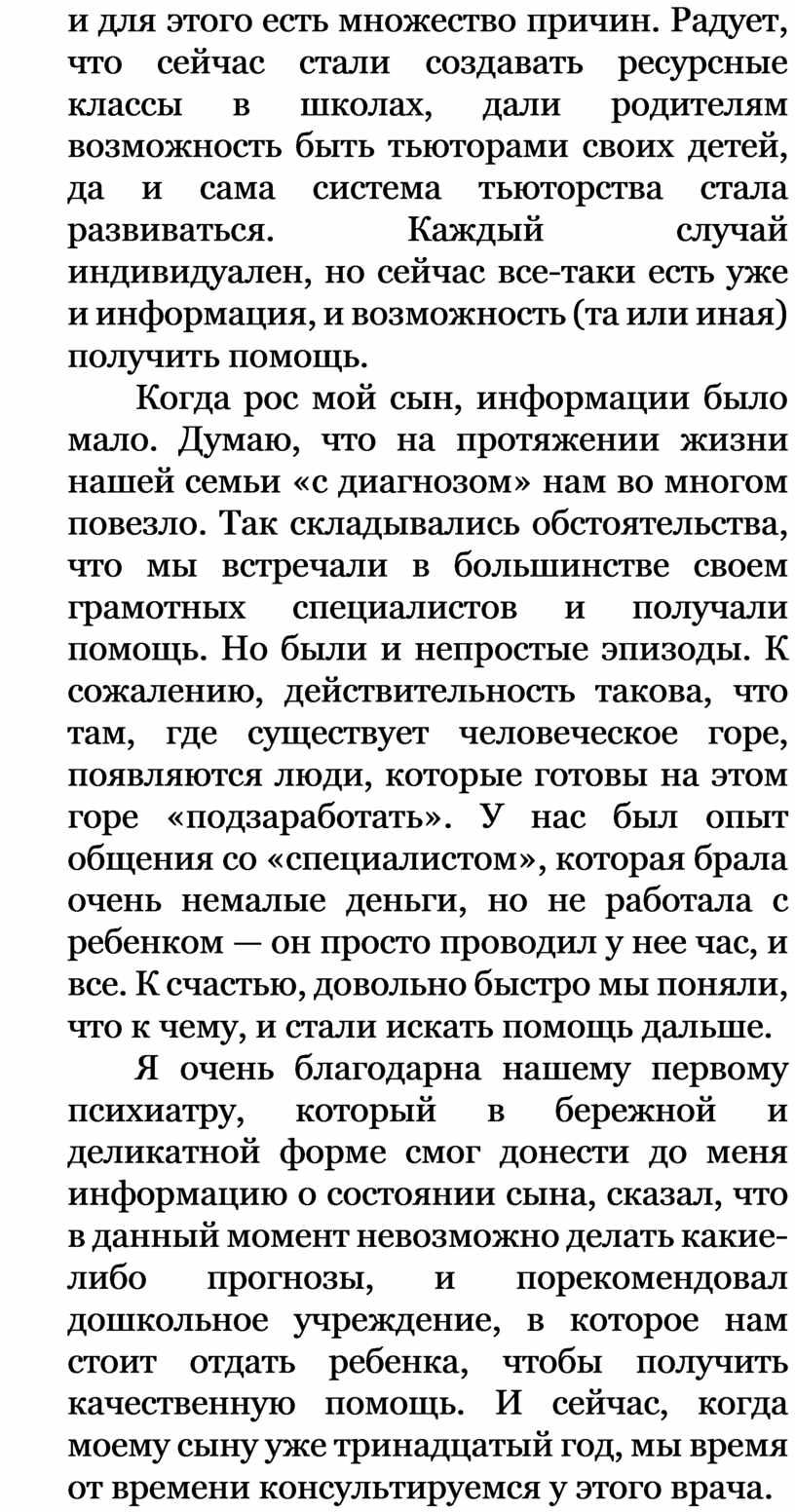 Я очень благодарна нашему первому психиатру, который в бережной и деликатной форме смог донести до меня информацию о состоянии сына, сказал, что в данный момент невозможно делать какие-либо прогнозы, и порекомендовал дошкольное учреждение, в которое нам стоит отдать ребенка, чтобы получить качественную помощь. И сейчас, когда моему сыну уже тринадцатый год, мы время от времени консультируемся у этого врача.