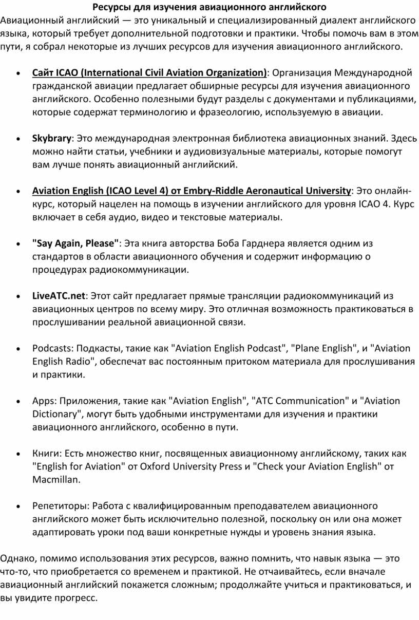 Авиационный английский — это уникальный и специализированный диалект английского языка, который требует дополнительной подготовки и практики. Чтобы помочь вам в этом пути, я собрал некоторые из лучших ресурсов для изучения авиационного английского.