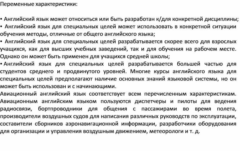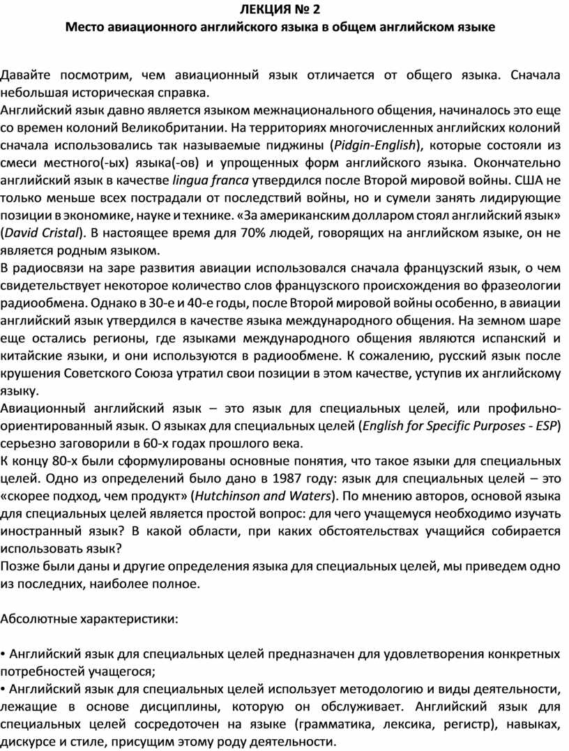 Авиационный английский язык – это язык для специальных целей, или профильно- ориентированный язык. О языках для специальных целей (English for Specific Purposes - ESP) серьезно заговорили в 60-х годах прошлого века.