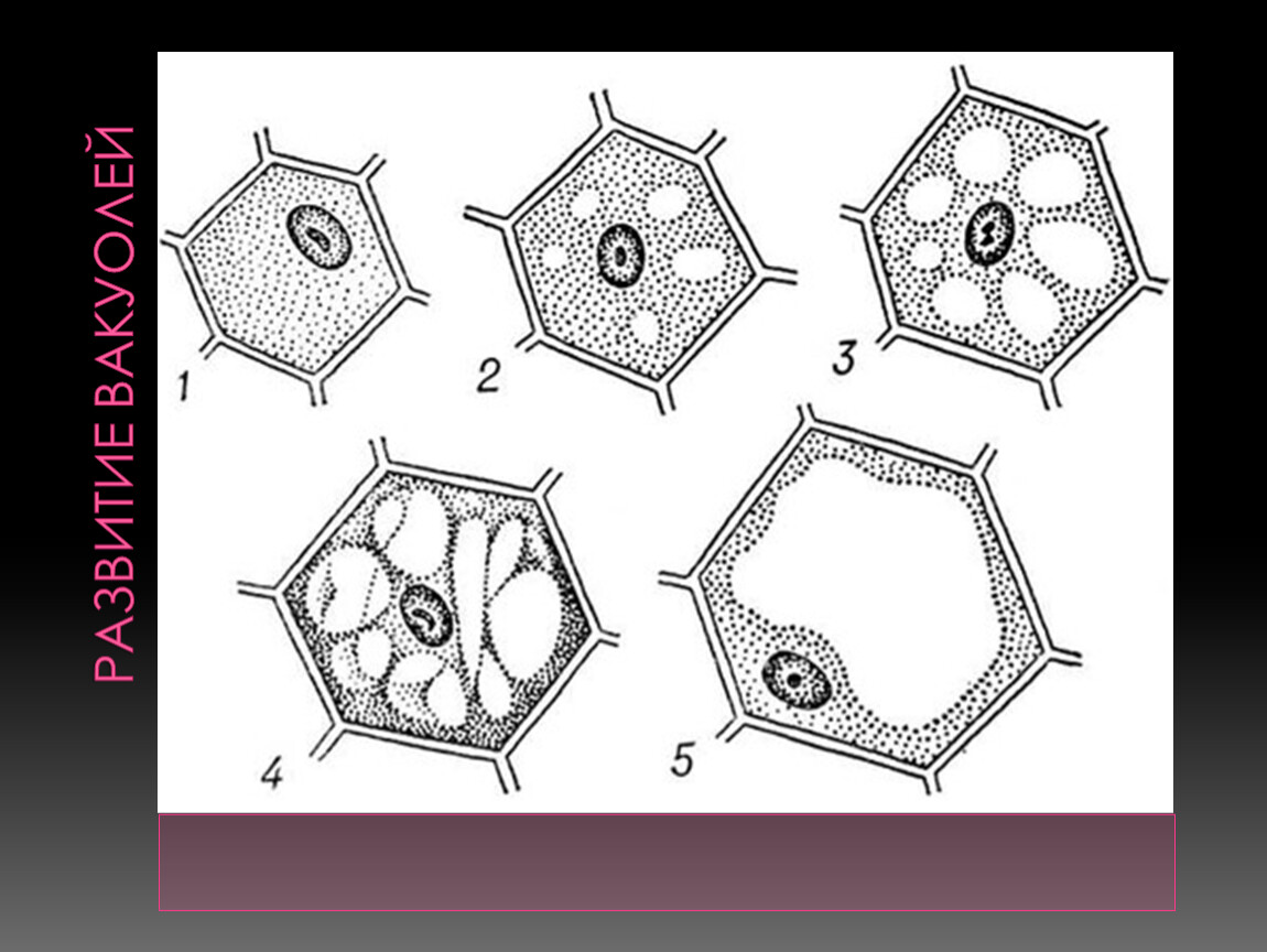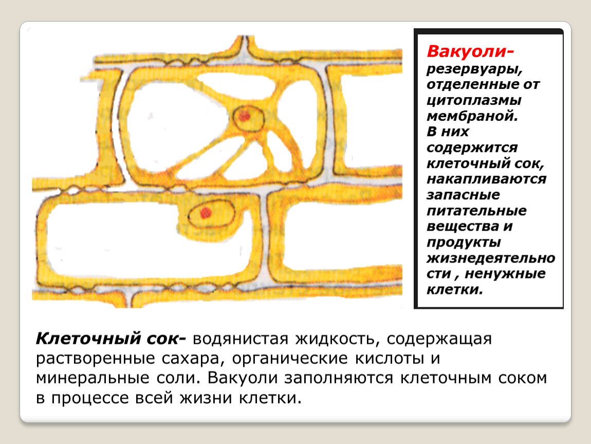Клеточный сок- водянистая жидкость, содержащая растворенные сахара, органические кислоты и минеральные соли. Вакуоли заполняются клеточным соком в процессе всей жизни клетки.