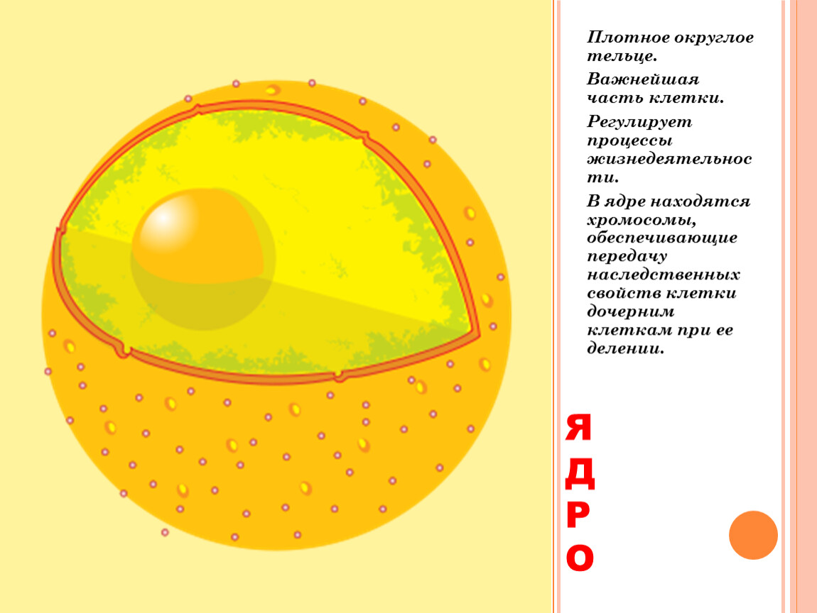 В ядре находятся хромосомы, обеспечивающие передачу наследственных свойств клетки дочерним клеткам при ее делении.