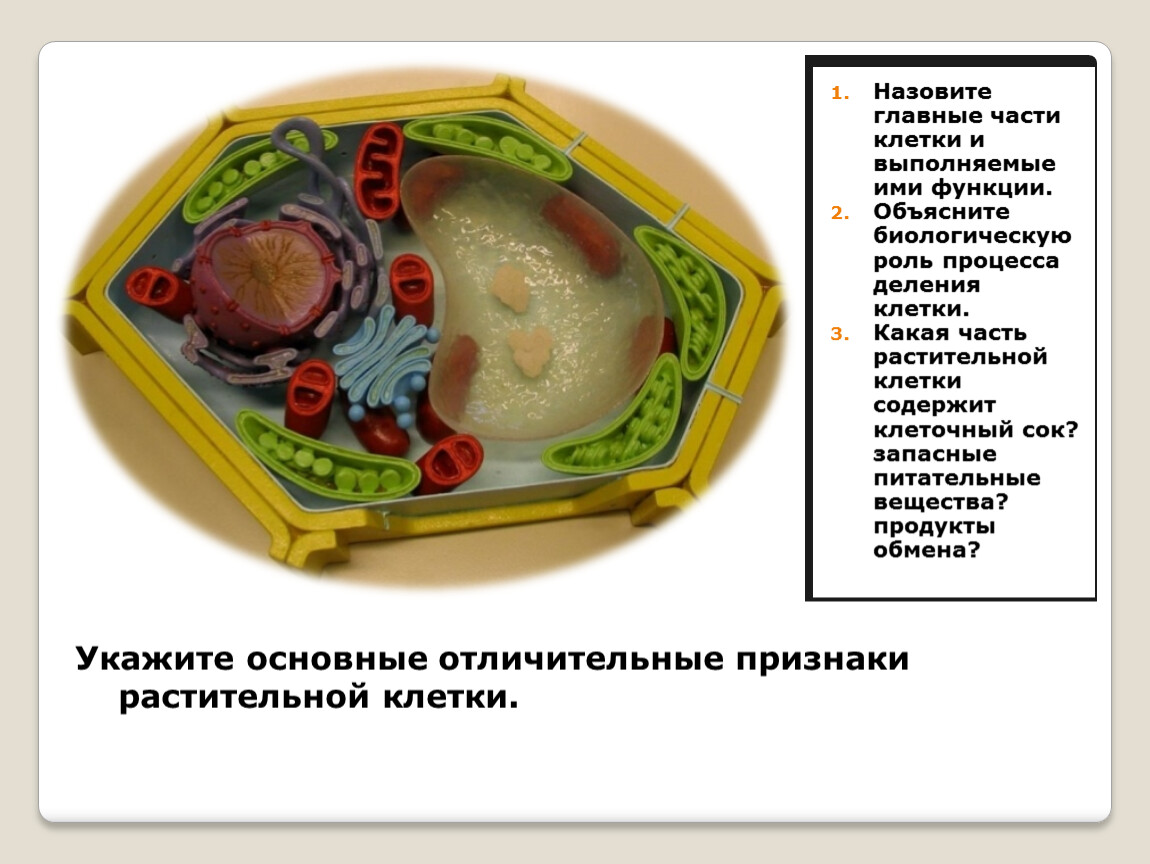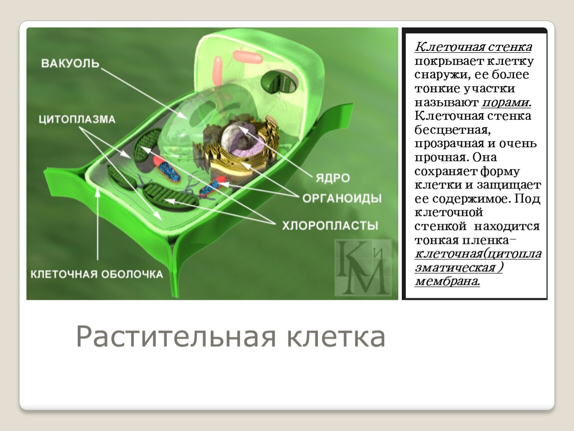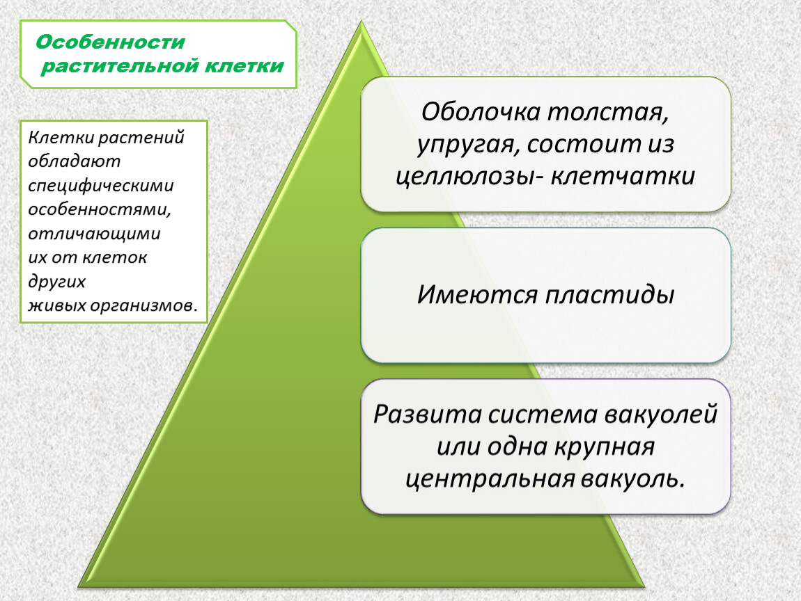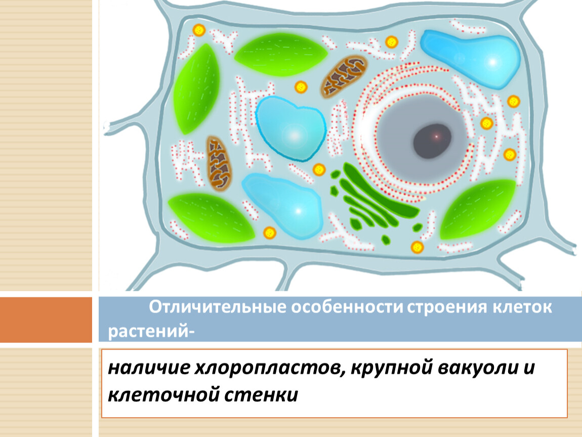 наличие хлоропластов, крупной вакуоли и клеточной стенки