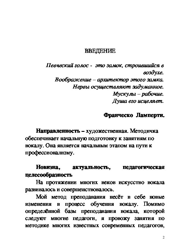 Направленность – художественная. Методичка обеспечивает начальную подготовку к занятиям по вокалу. Она является начальным этапом на пути к профессионализму.