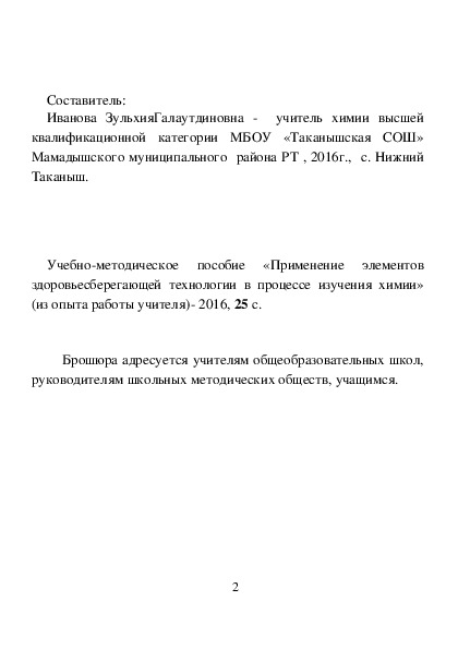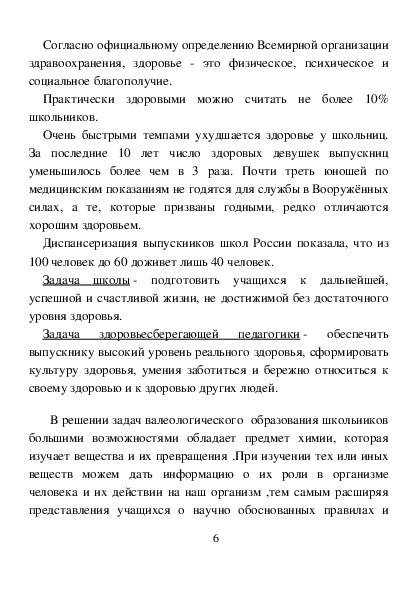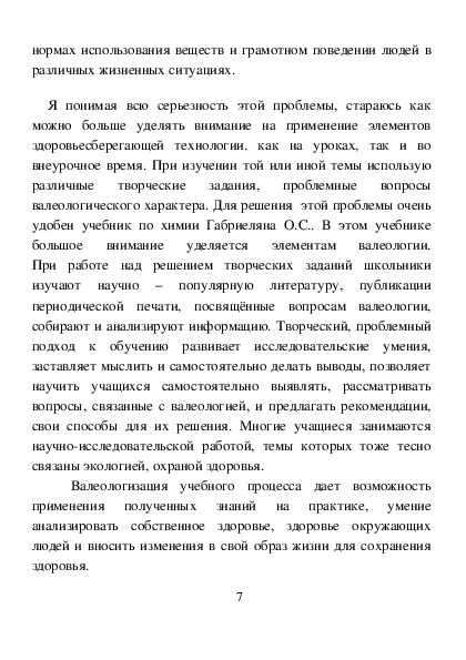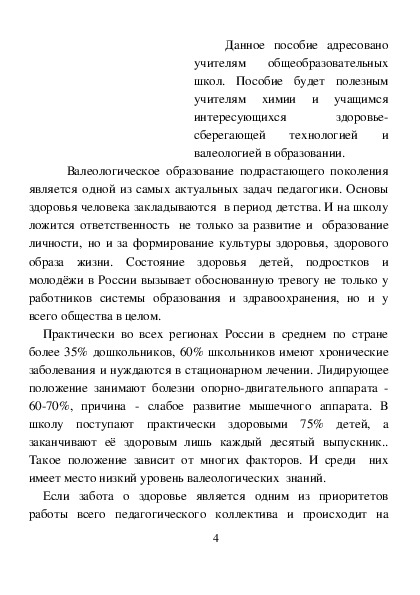Методическое пособие из опыта работы учителя. Брошюра адресуется учителям общеобразовательных школ, руководителям школьных методических обществ, учащимся.Пособие будет полезным учителям химии и учащимся интересующихся здоровье-сберегающей технологией и валеологией в образовании. Валеологизация учебного процесса дает возможность применения полученных знаний на практике, умение анализировать собственное здоровье, здоровье окружающих людей и вносить изменения в свой образ жизни для сохранения здоровья.Методическое пособие