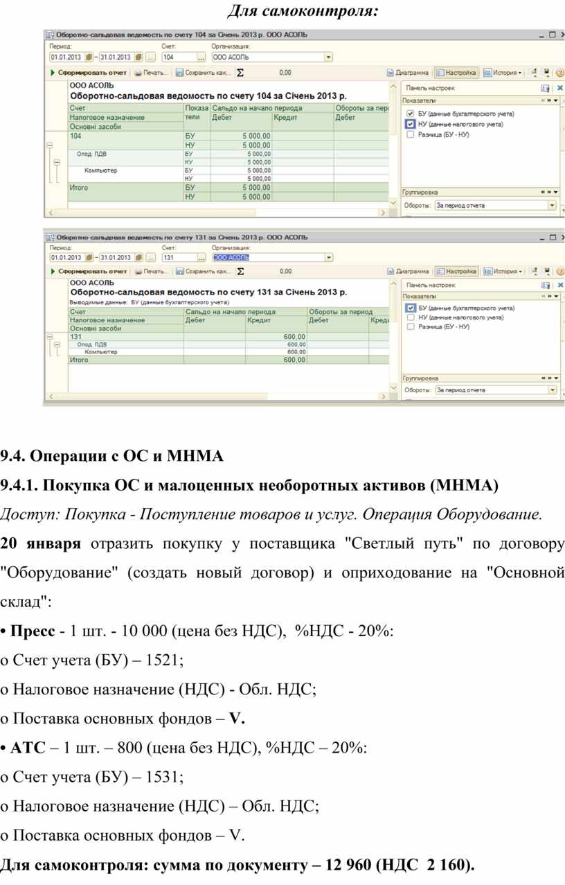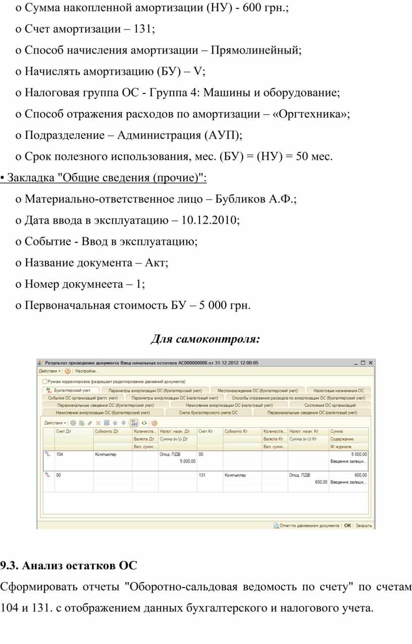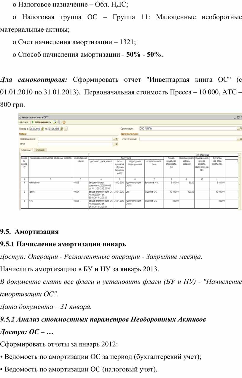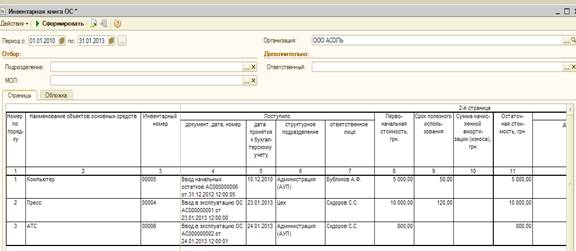 Для самоконтроля: Сформировать отчет "Инвентарная книга ОС" (с 01.01.2010 по 31.01.2013). Первоначальная стоимость Пресса – 10 000, АТС – 800 грн.