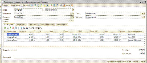 • акт полученных услуг от контрагента "АТП-1220" по транспортировке товара (документ "Поступление доп. расходов").